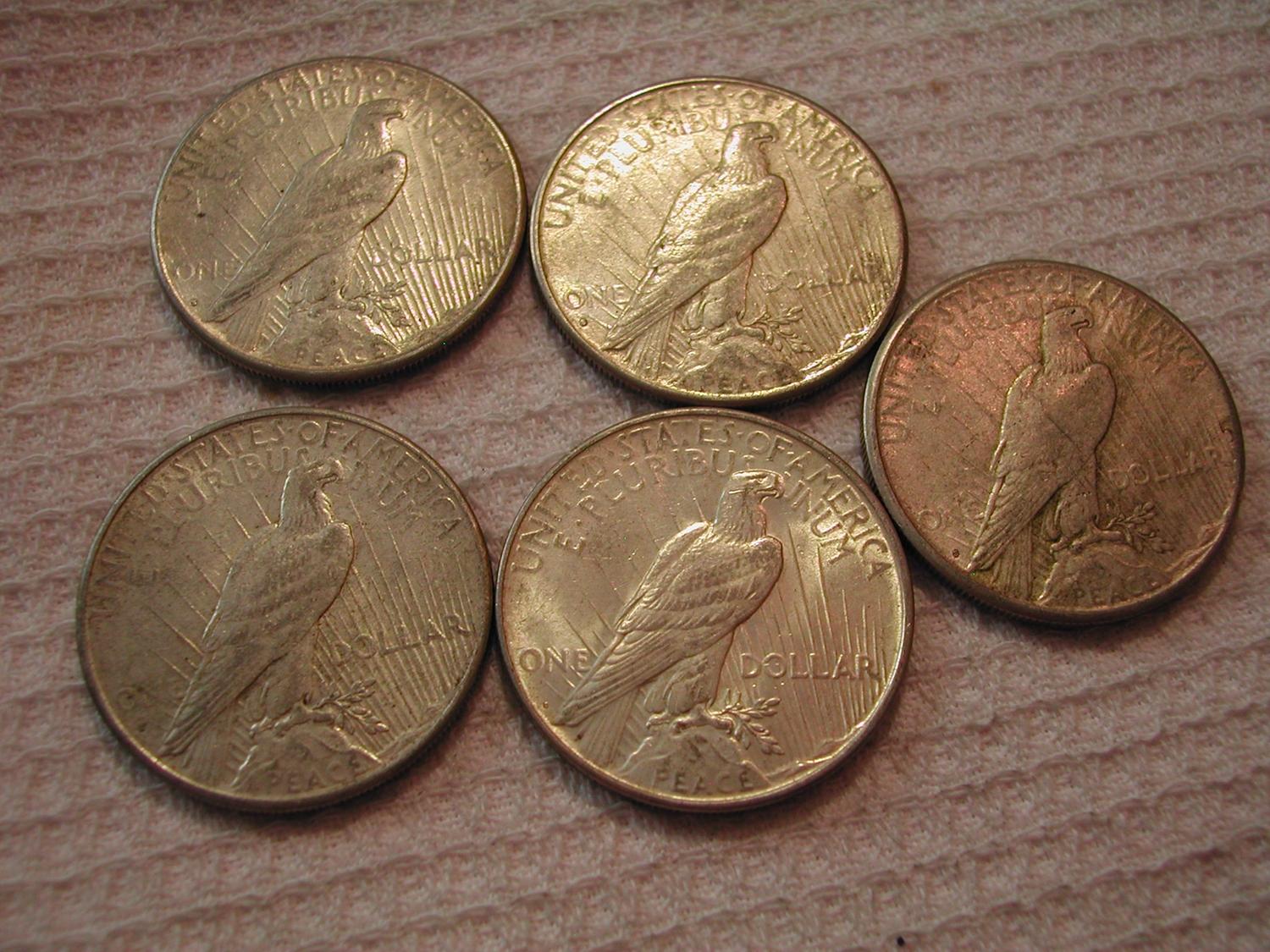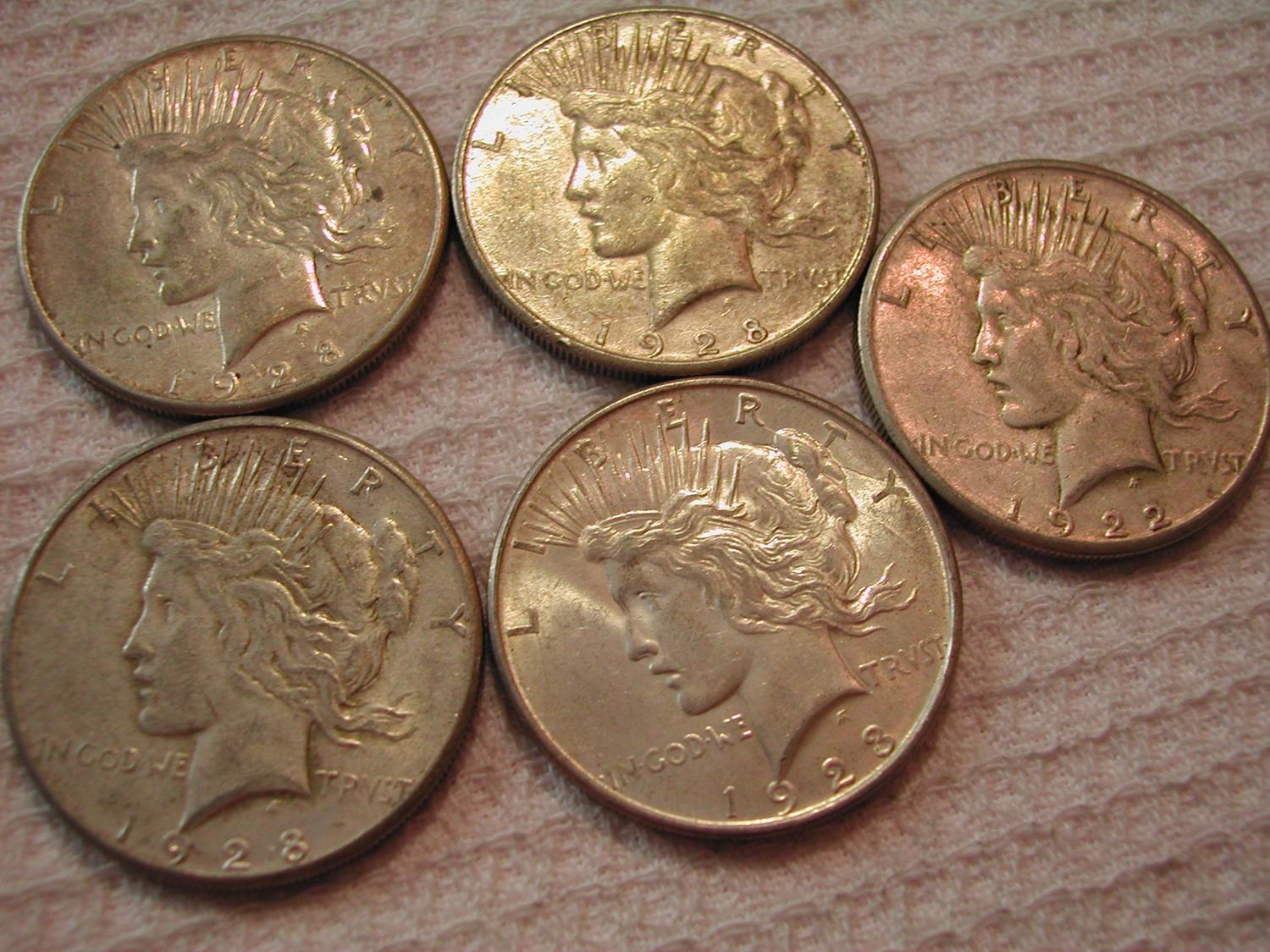 5 Peace Silver Dollars 1922, 1923, 1928 (x3) - One Money