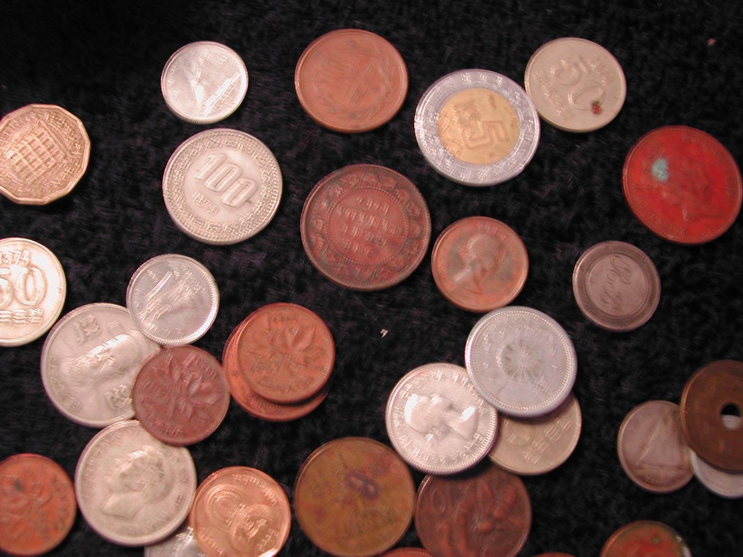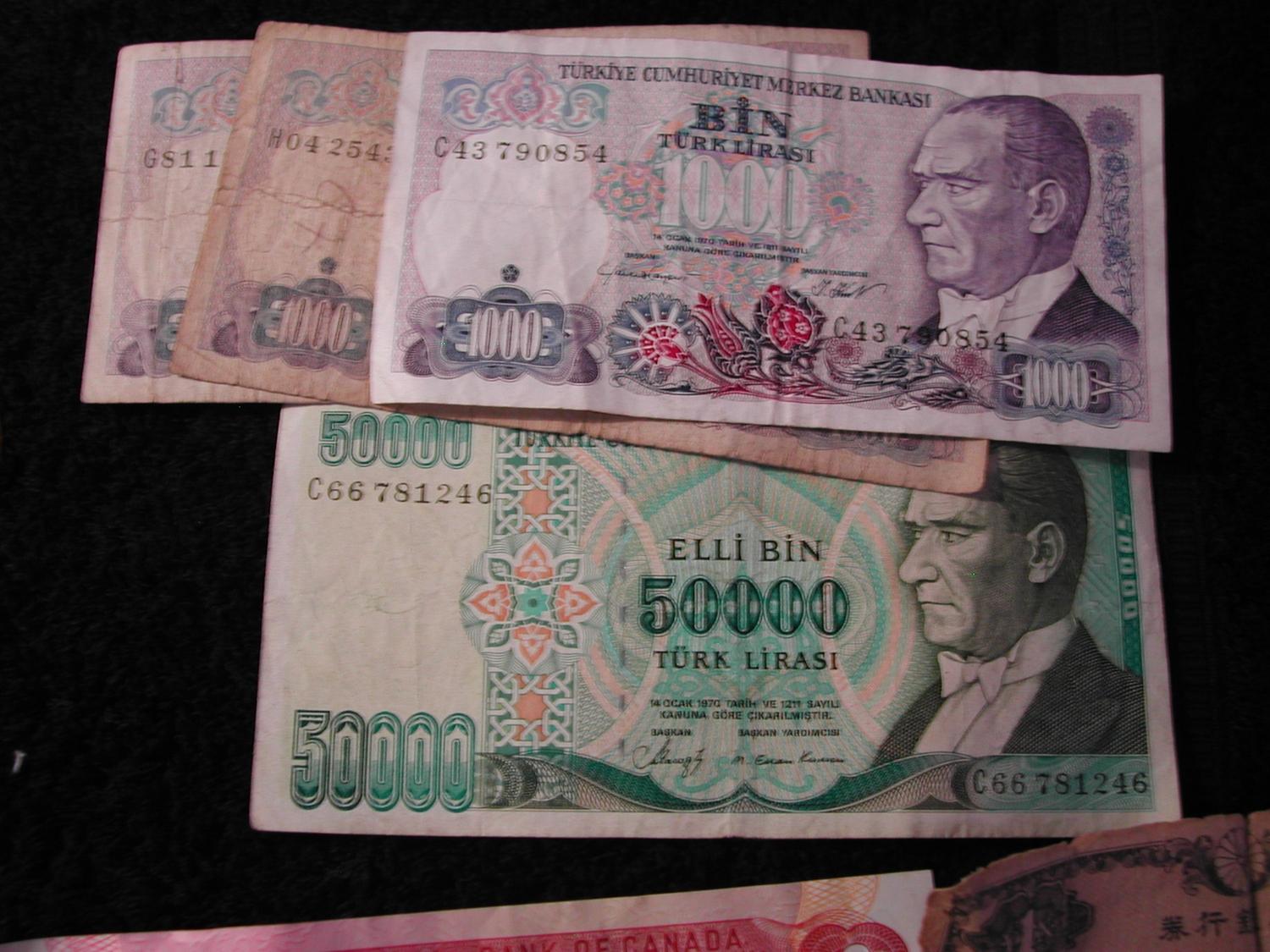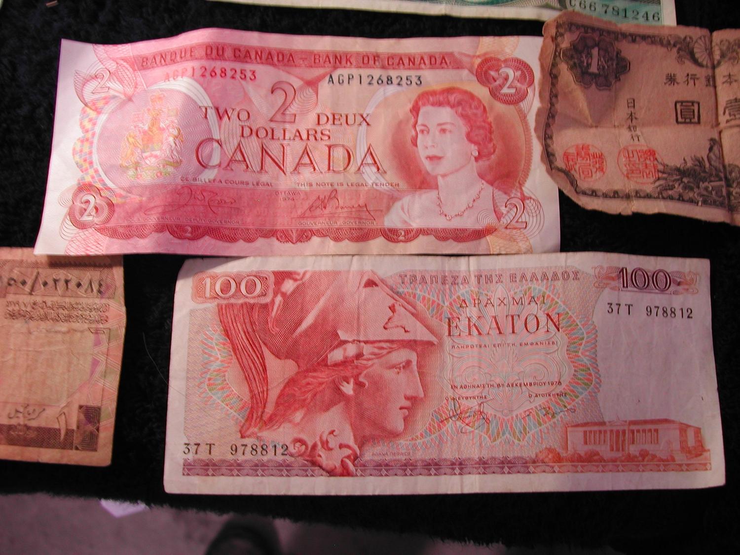 53,000 Turkish Lira, $2 Canadian, 1 Yen, 100 Greek Drachma, 1 Saudi Riyal, coins from Mexico, Canada, China, Italy, Bahamas, Great Britain and moredating from 1907 - 1989