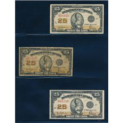 DOMINION OF CANADA 1923 25 Cents Hyndman-Saunders. Lot of 3 notes, DC-24b. VG-VF