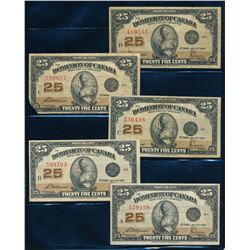 DOMINION OF CANADA 1923 25 Cents McCavour-Saunders. Lot of 5 notes, DC-24c. VG-VF