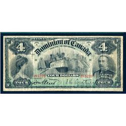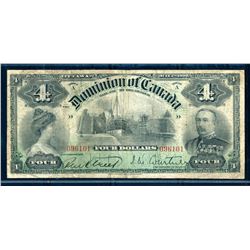 DOMINION OF CANADA 1900 25 Cents. Lot of 4 Banknotes, DC-15. graded: VG-VF Description: 15a Courtney 114 x 60 mm. VG., 15b Bouville 115 x 62 VF., 2