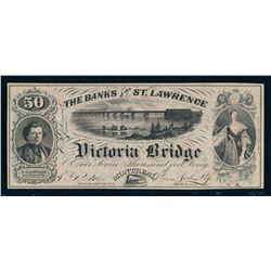 THE BANKS OF THE ST.LAWRENCE 1857 Advertising Banknote. GUnc. Description: No serial number, vignettes of the Victoria Bridge, Queen Victoria and D.