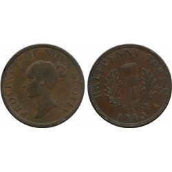 3597 - NS-1F1, PNS-705, Breton 874, Halfpenny 1843 Nova Scotia, nice reverse for variety. VFMTC AUCTIONS - Canadian Coins, Banknotes, World, Stamps, Medals
