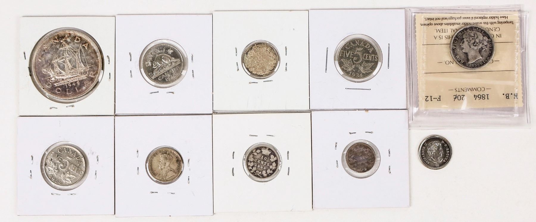 Ten Canadian coins: 1864 New Brunswick 20 cent, (F); 1884 five cents, holed; 1888 ten cents (G); 1914 ten cents (VG); 1933 five cents (AU); 1934 five cents (BU); 1936 ten cents (AU); 1942 five cents (BU); 1949 one dollar (AU); 2021 ten cents (BU).