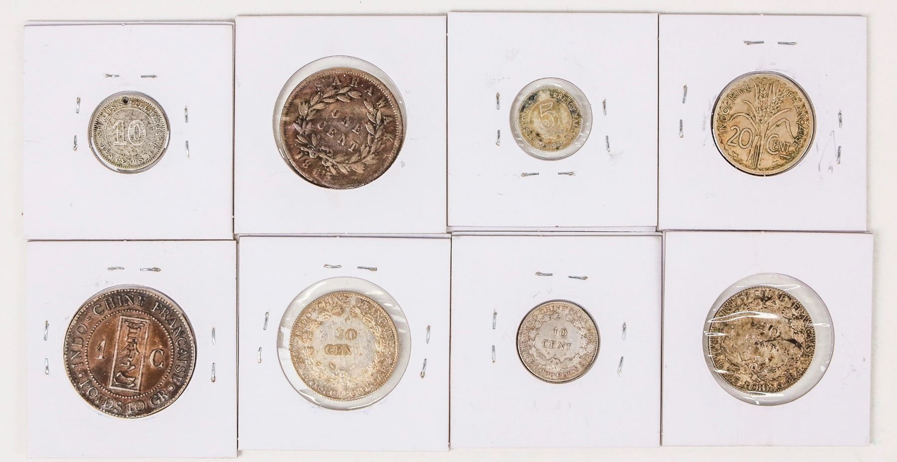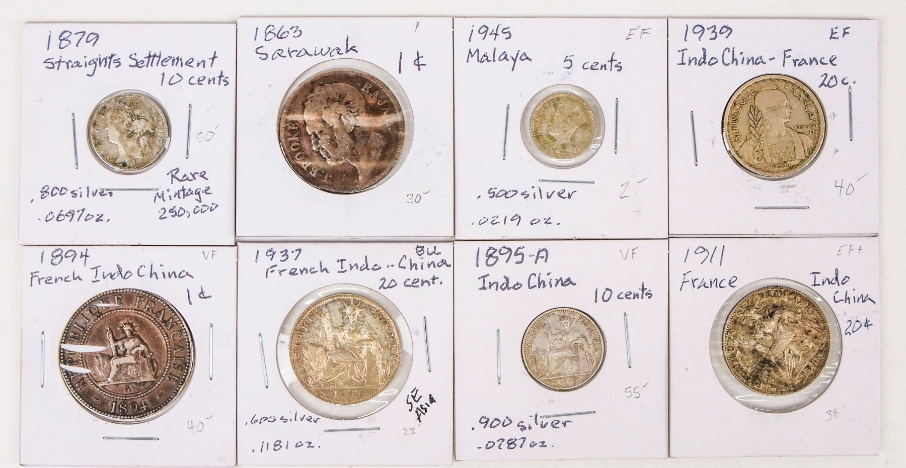 Five coins from French Indo China: 1894 one cent; 1895-A ten cents; 1911 twenty cents; 1937 twenty cents; 1939 twenty cents. Also: 1863 Sarawak one cent; 1879 Straits Settlements ten cents (holed) ; 1945 Malaya five cents.