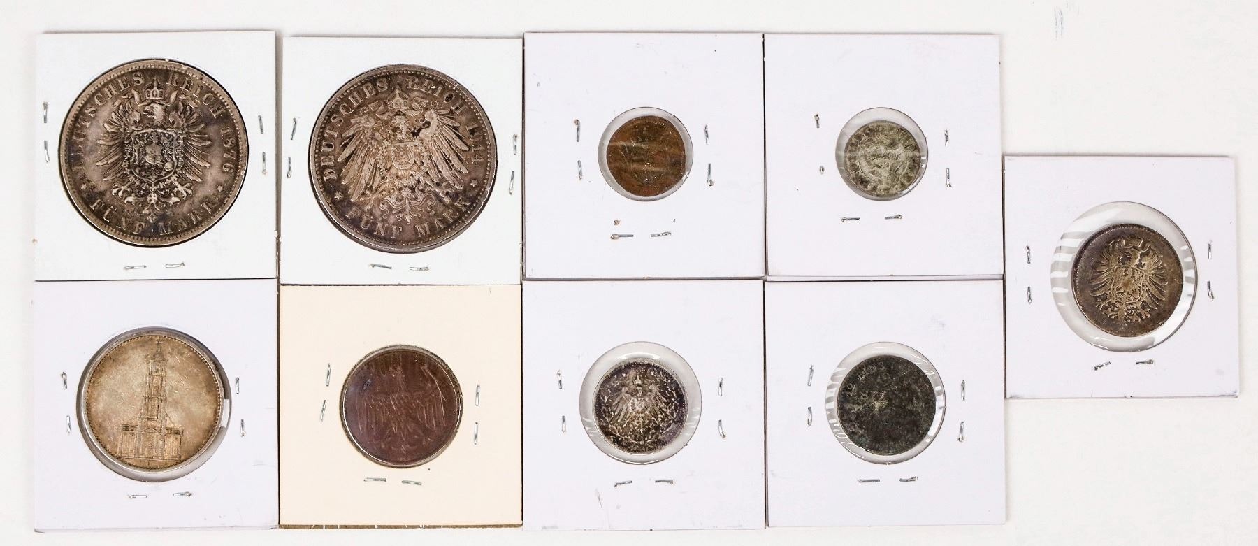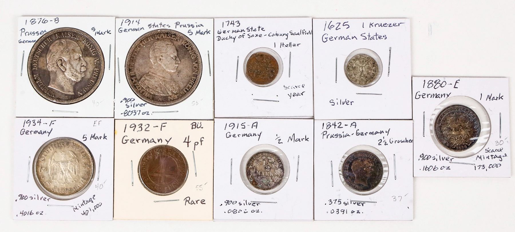 Nine coins: 1625 German States one kruezer; 1743 German State Duchy of Saxe one heller; 1842-A Prussia-Germany 2 1/2 Silbergroschen; 1876-B five mark; 1880-E one mark; 1914 German States Prussia five mark; 1915-A Germany 1/2 mark; 1932-F Germany four pfennig; 1934-F Germany five mark.
