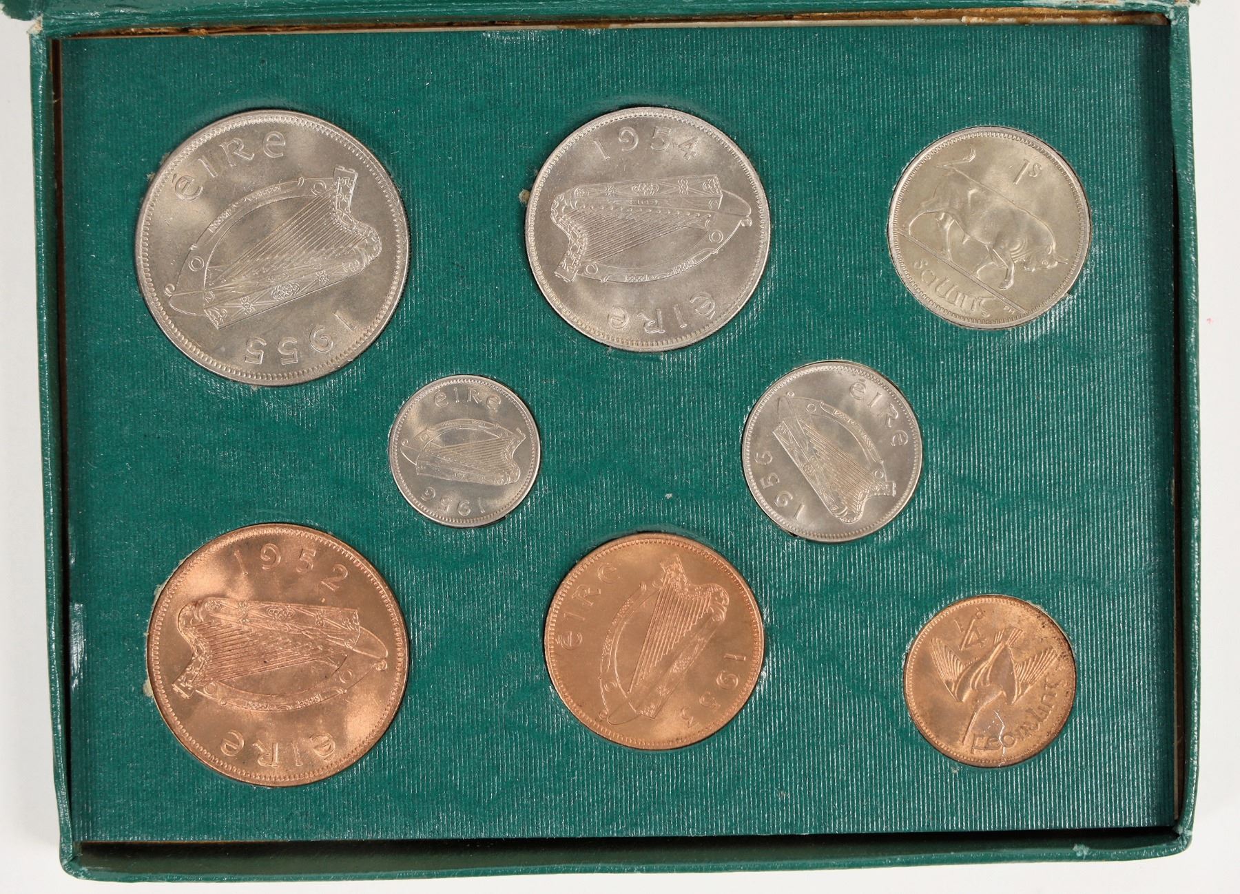 Boxed set of eight uncirculated Irish coins from the 1950s.