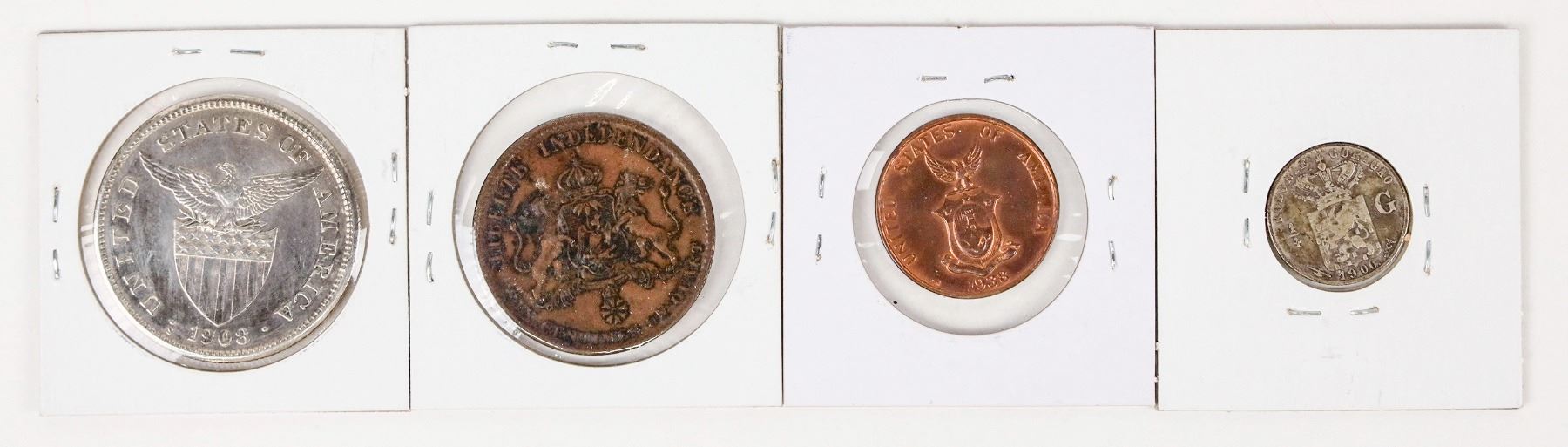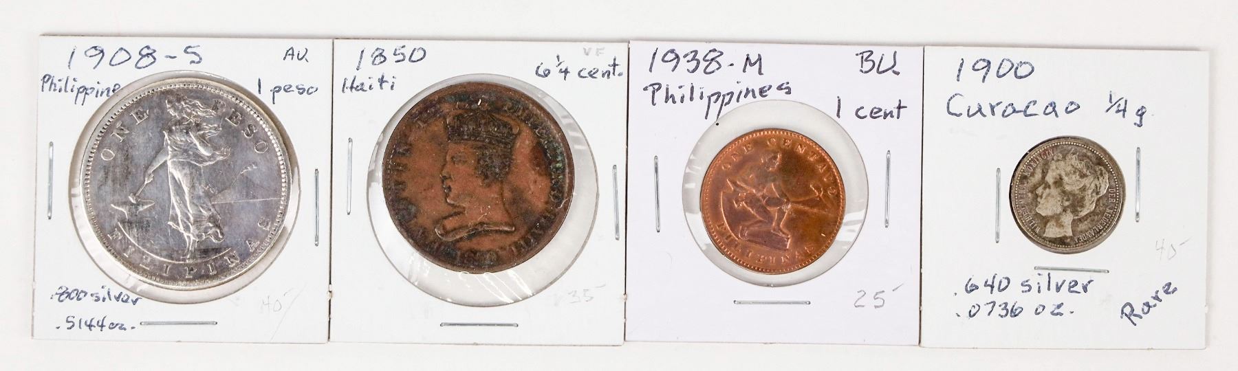 Four foreign coins: 1) 1850 Haiti Faustin I six 1/4 centimes. 2) 1900 Curacao 1/4 gulden (.640 silver; .0736 oz.) rare. 3) 1908-S Philippine peso (.800 silver; .5144 oz.) AU condition. 4) 1938-M Philippine one cent BU.