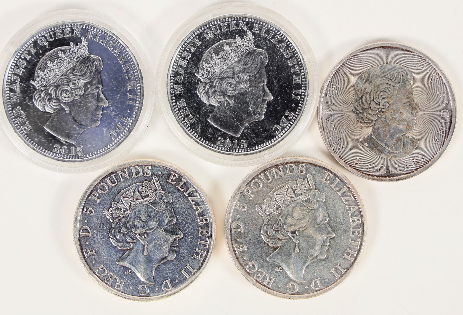 Five coins with Queen Elizabeth II on the obverse: 1) 2016 Canada $8 (1 1/4 oz. silver) Buffalo; 2 & 3) 2017 Great Britain 5 pounds Red Dragon of Wales, (each 1 oz. silver); 4 & 5) 2015 One Crown Tristan da Cunha with Saint Raphael The Archangel reverse. Silver plated copper nickel with gold plating.