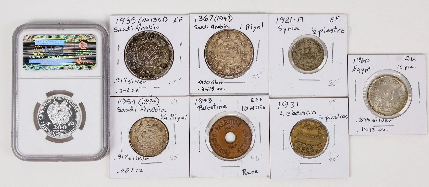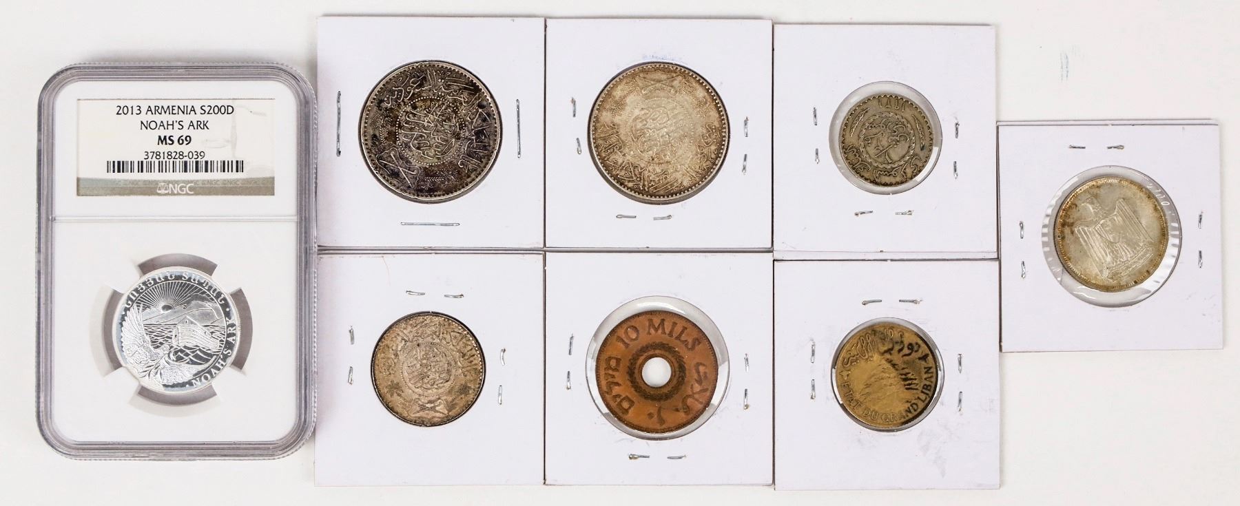 Eight coins: Palestine 1943 ten Mils; Syria 1921 1/2 piastre; Lebanon 1931 five piastres; Egypt 1960 ten piastres; Armenia 2013 Noah's Ark (1/2 oz. silver); Saudi Arabia 1935, 1947 one Riyal (.34 oz.; .917 silver); 1954 1/4 Riyal (.087 oz.).
