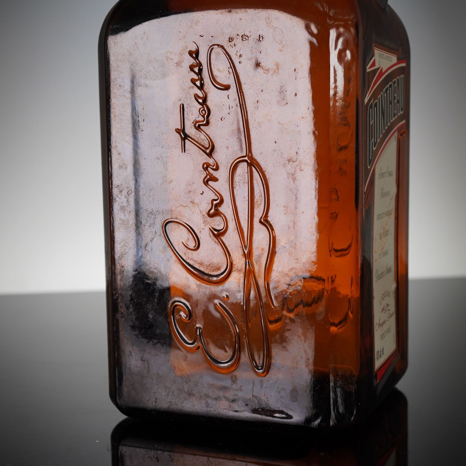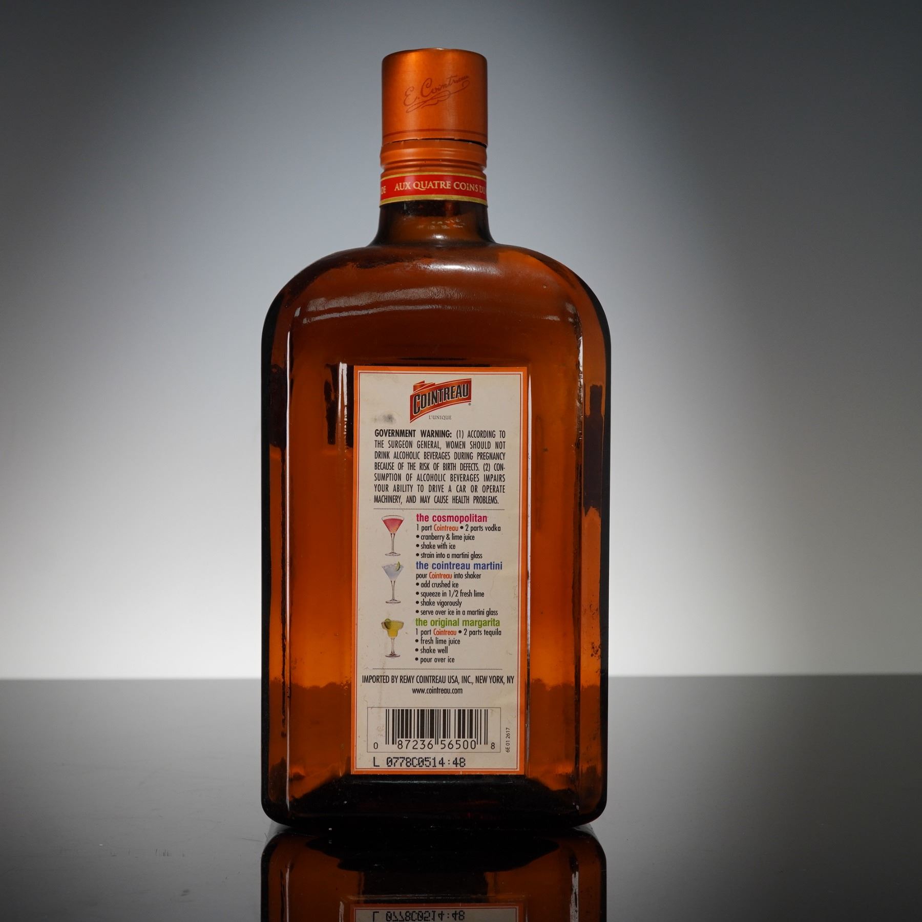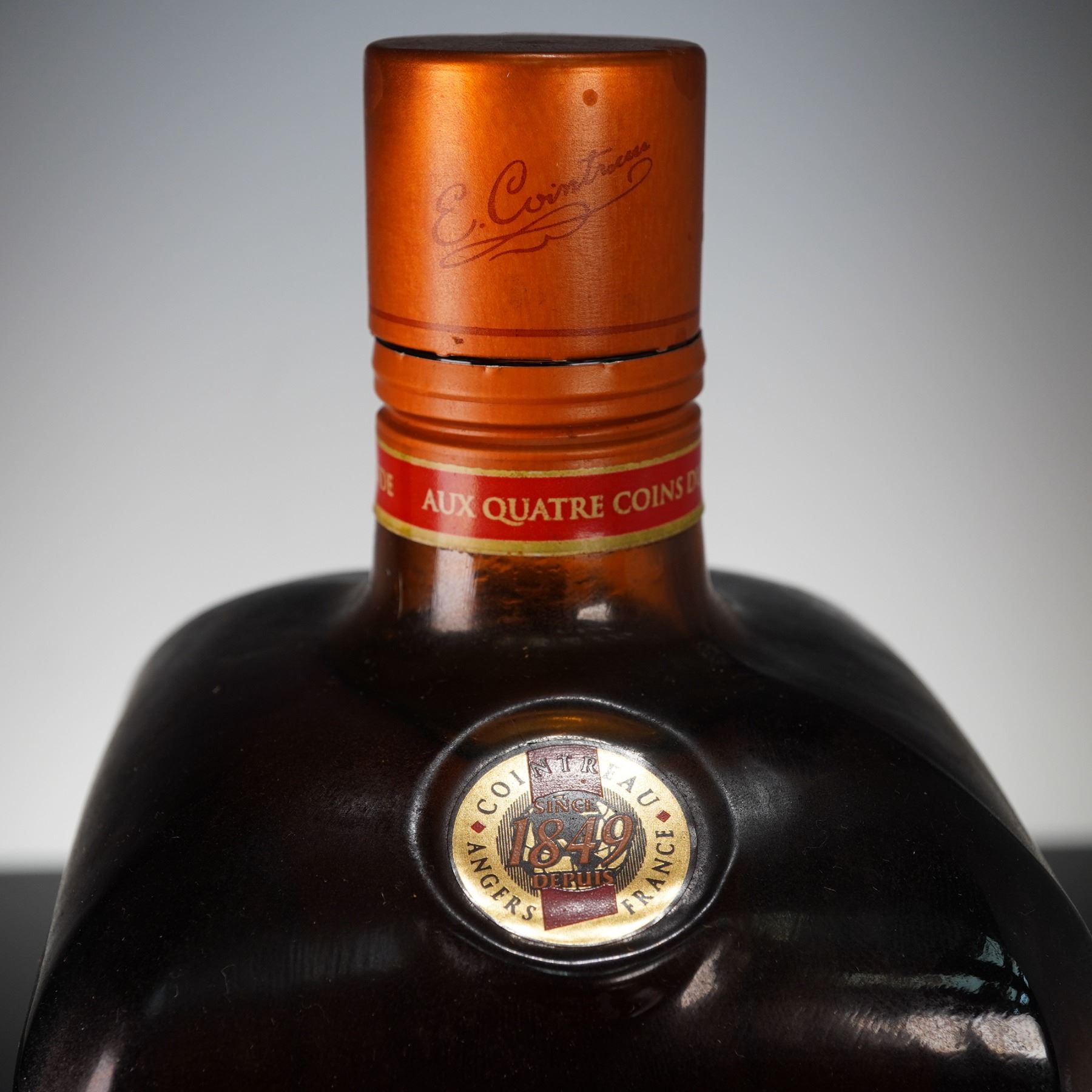 Original 1-liter bottle of Cointreau triple sec orange liqueur, produced in Angers, France. The bottle features the signature square amber glass design with embossed "E. Cointreau" lettering and red and gold labeling. In-house shipping is not available for this lot. Winning Bidders will have to arrange to pick up their purchases at the Lion and Unicorn Auction Studios at 200 Oakwood Ln. Suite 200 Hollywood, Florida 33020, or make arrangements with their own third-party shipper. A local third-party shipper that can be contacted directly for a domestic shipping quote is: First Class Shipping Center 7826 NW 44th Street Sunrise, FL 33351 Tel: 754-800-7674 Fax : 954-999-5166 Email: 1shippingcenter@gmail.com URL: https://www.1shippingcenter.com