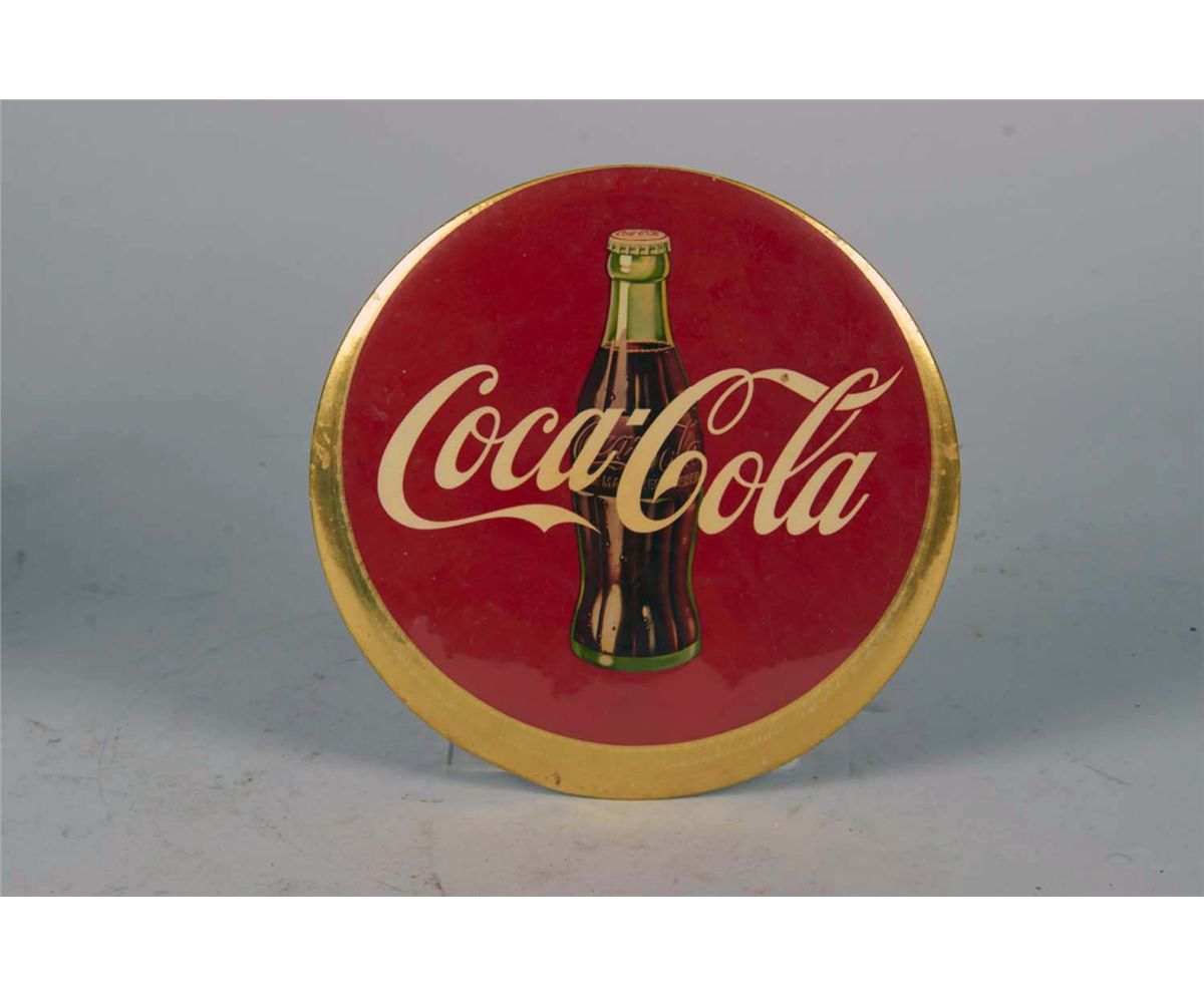 Flat button sign with cardboard easel back and string for easy display. Shows the iconic Coke bottle circa 1950's. Production error - Image is off center. Condition (Good). Size 9"