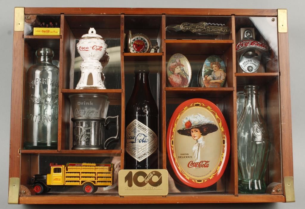 Anniversary shadow box, with toy truck, advertising tin, pocket watch, coke bottle, bottle openers and compact mirror.