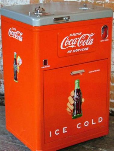 Flat top, front load coke machine. Front door drops down for bottle storage. Coin operated. Excellent restoration.