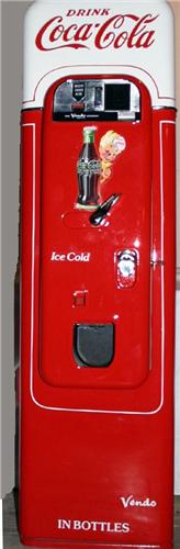Coke machine Vendo Model #44 takes a dime. Raised “Drink Coca Cola” letters at top. One of the most desirable of coke machines. Perfectly restored. 58" x 16" x 18".