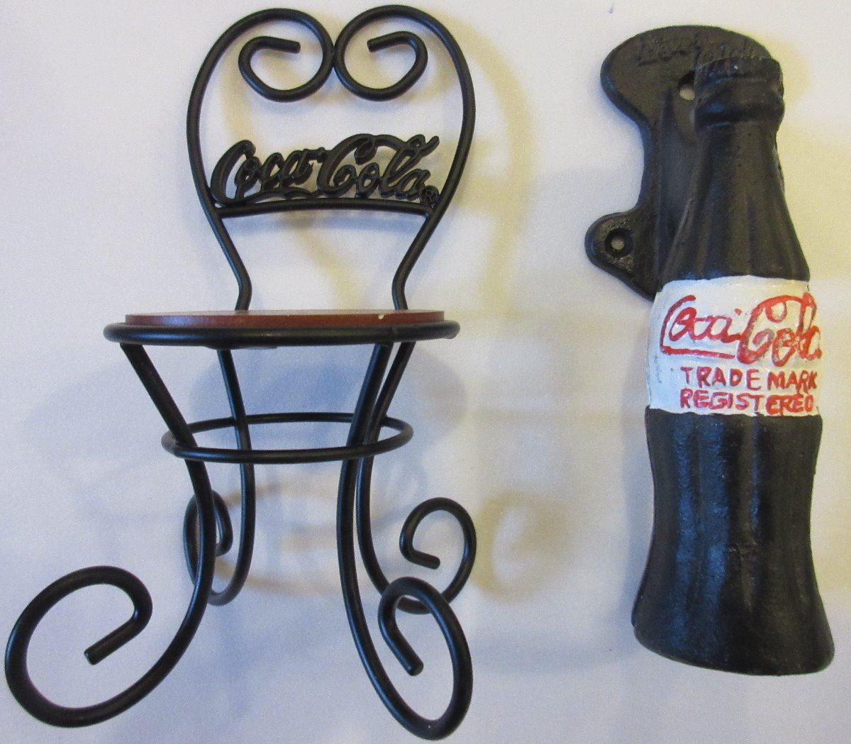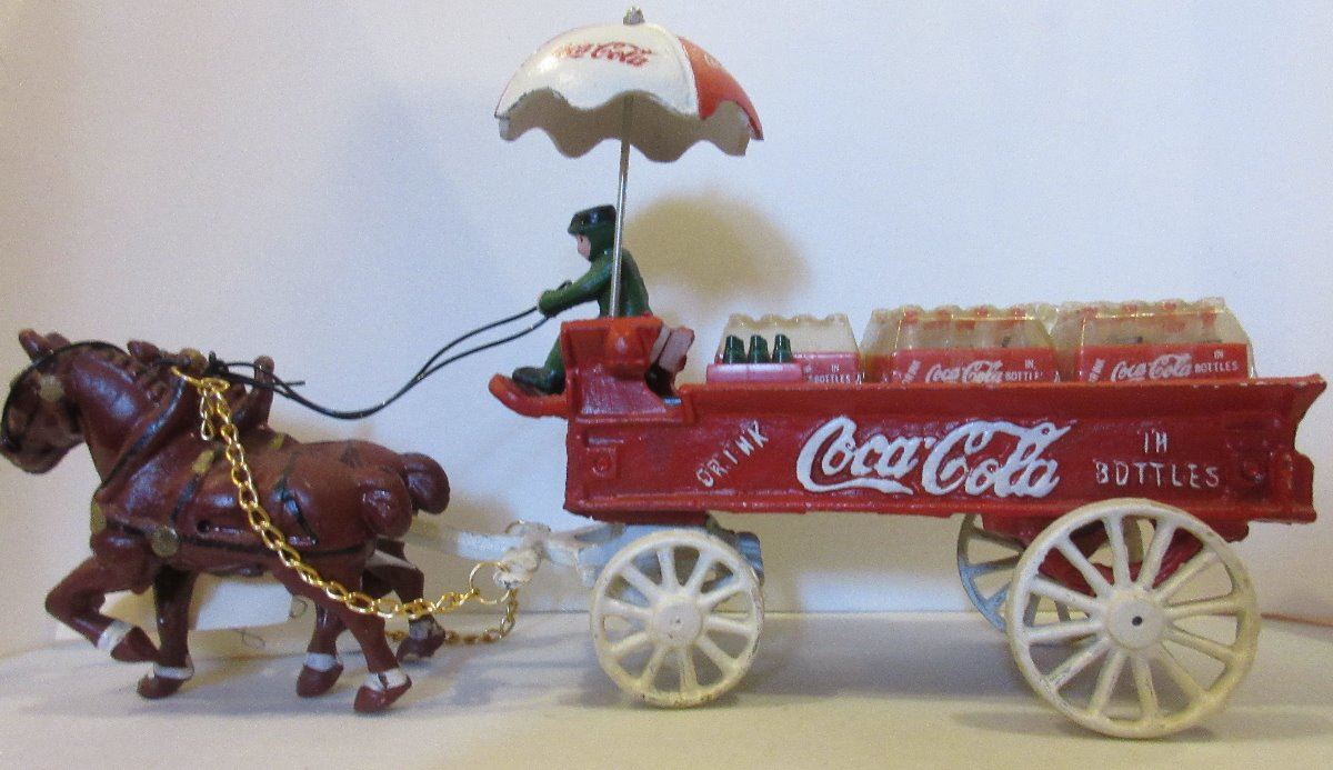 Lot of Coca Cola Mini Café Style Chair with Coca Cola written on back, Coca Cola Metal Door Handle 1970s, Coca Cola Delivery Horse and Wagon with Bottles and Cast Iron reproduction