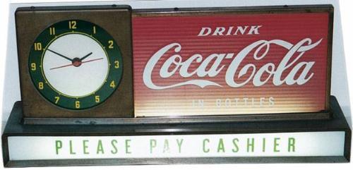 1940's countertop lighted clock and sign. Upper right glass is probably a replacement. The clock face and bottom glass appear original. Fairly clean overall except for heavy wear on the gold toned surfaces. Cond. 7.0.
