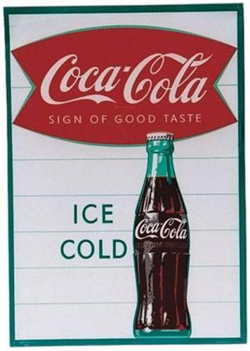 1960 20"x28" tin sidewalk sign with bottle. Clean item with only some minor edge light scratches and marks. Some very shallow crimps and dents. A little minute spider webbing at the edges. Cond. 8.6-8.9+.