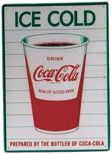 20"x28" 1960's vertical cup sign. Very slight ambering, some minor small marks, light surface scratches, a few tiny dents and crimps in the center of the sign. Edge bends on the raised frame. Cond. 8.2-8.5.