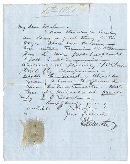 War-dated autograph letter signed by Colonel Elmer Ellsworth just one week before he would become the first well-known casualty of the Civil War. Single page quarto datelined Washington, 16 May 1861, Ellsworth writes to his second-in-command, Lieutenant Colonel Noah L. Farnham, “…Have struck a lead. Am doing a good thing for the boys. Shall have to remain here untill tomorrow 10 O'clock. Have the men pack knapsacks & fall in & commence drilling at precisely 9 O'Clock. Drill by companies. Double the guard. Allow no man to leave the ground. Have the quartermaster meet me at Willards at precisely 8 O'Clock. / Keep things going until I return…” Although the month is not written, we are able to date this letter to May 1861 because Farnham was Ellsworth's immediate subordinate in the New York Fire Zouaves, which was organized in April 1861. The mention of Willard's Hotel places the regiment in Washington. Some fold wear including minor splits, and numerous spots of blotting. Pinned to the letter is a 1” square of light gray fabric, purportedly from the flag that Ellsworth cut down. These were popular souvenirs of the famous incident. Minute chipping to top margin. Excellent condition.