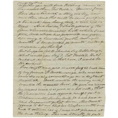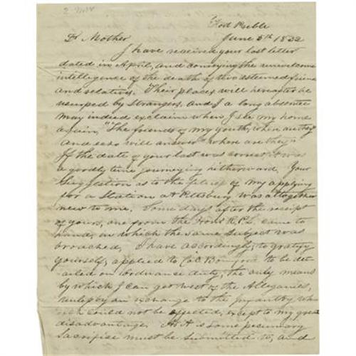 <B>Colonel William R. McKee, Killed at the Battle of Buena Vista, Autograph Letter Signed "</B></I><B><I>W. R. McKee</B></I></B></I><B>".</B></I> Three pages, 7.75" x 9.75", Fort Preble [Maine], June 5, 1832, to his mother Martha McKee, Lancaster, Kentucky, with the usual folds and a small hole where the wax seal was removed, else a fine legible letter. In this long letter McKee brings his mother up to date on his postings and future postings, informs her of the purchase of a gold watch for $83 dollars and complains about the cost of the new officer's uniforms (referring to the new uniform regulations of 1832). McKee was killed at the Battle of Buena Vista while commanding the Second Kentucky Regiment.<BR><BR><BR><b>Shipping:</b> Flat Material, Small (<a target="_blank" href="http://www.heritageauctions.com/common/shipping.php">view shipping information</a>)