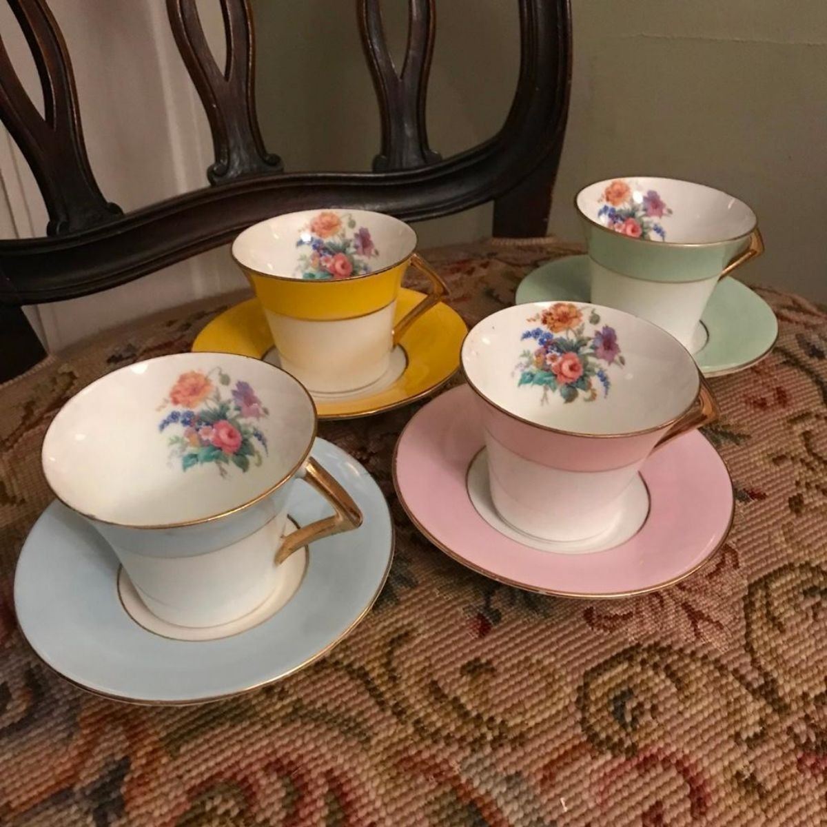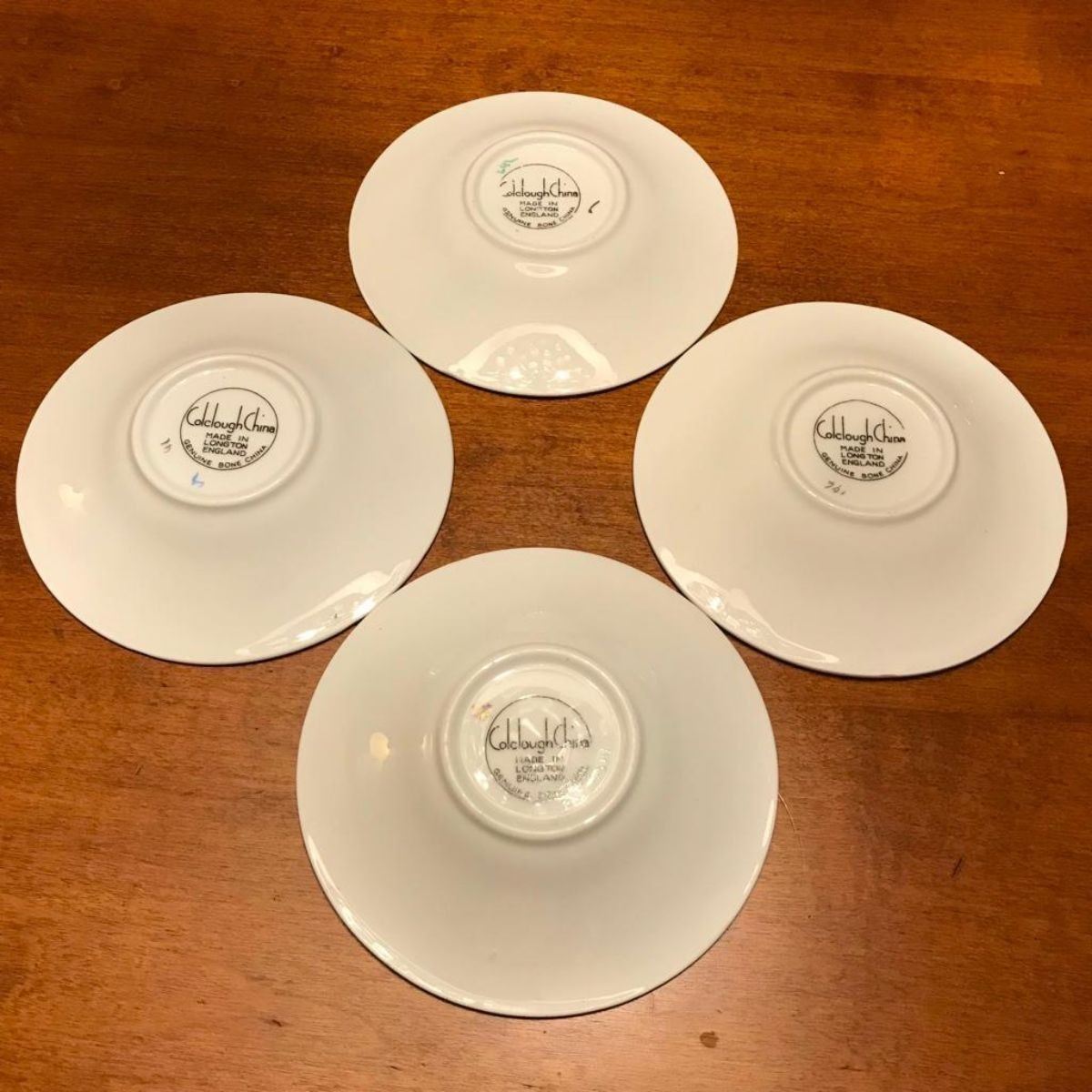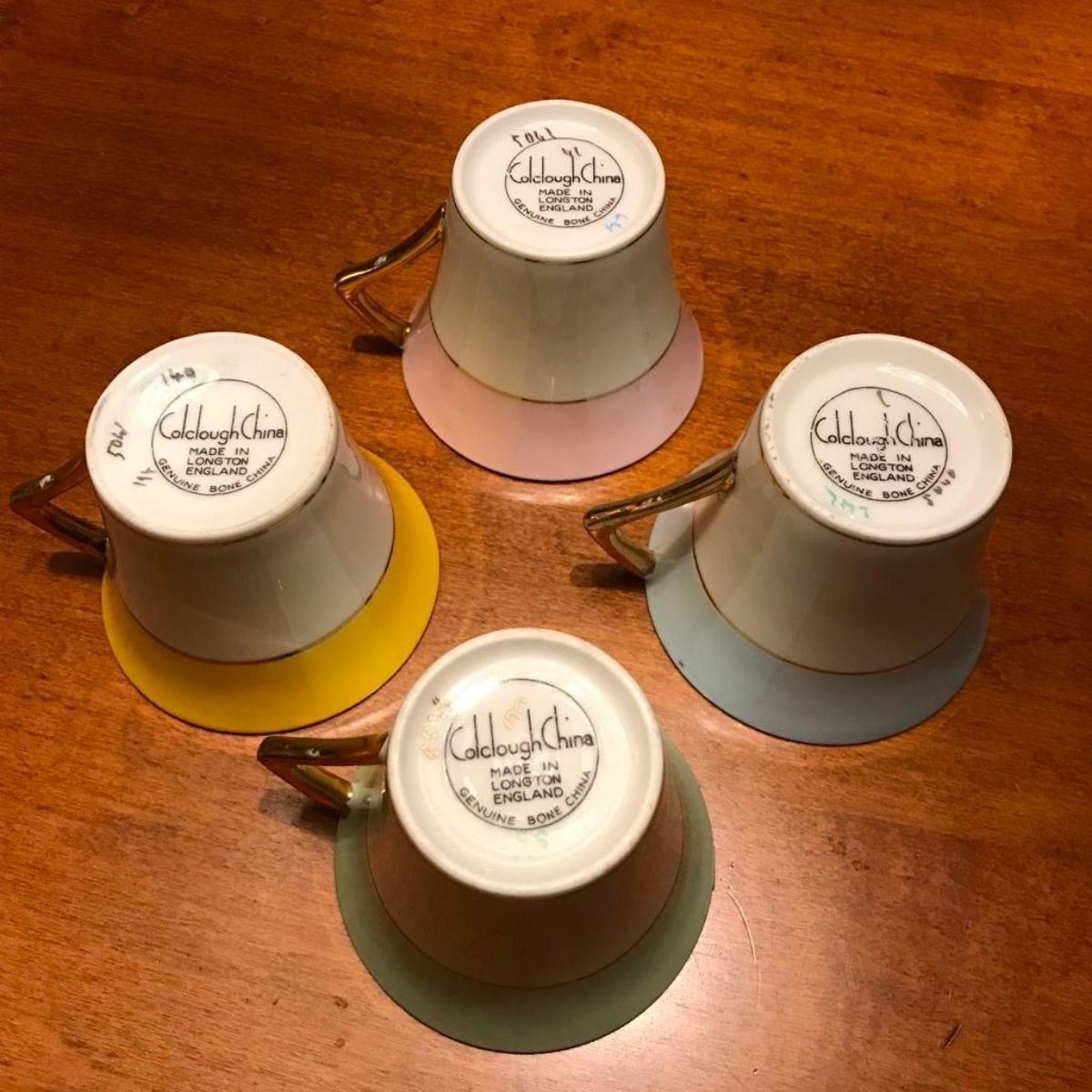 Set of four Colclough English bone china demitasse cups with matching saucers set. Four pastels, in pink, blue, yellow & green with matching floral motif & gilt edging for each. On the bottom of each cup & saucer printed Colclough China, Made in Longton England, Genuine Bone China. Also gilt number on each piece. A lovely set.Â