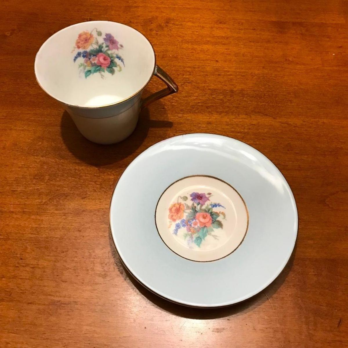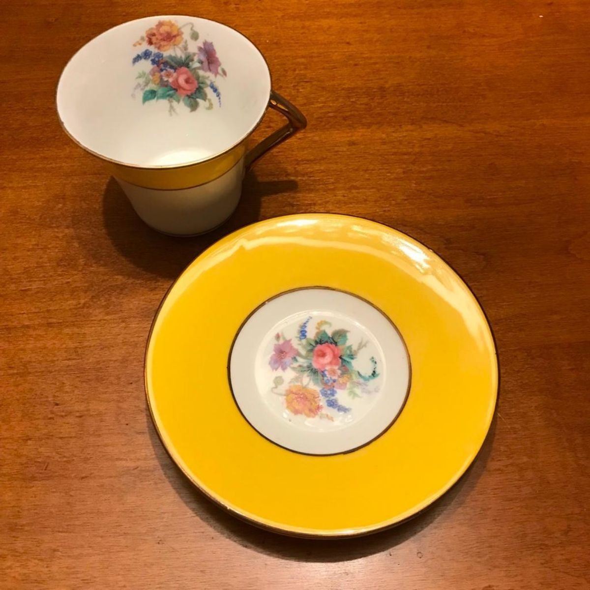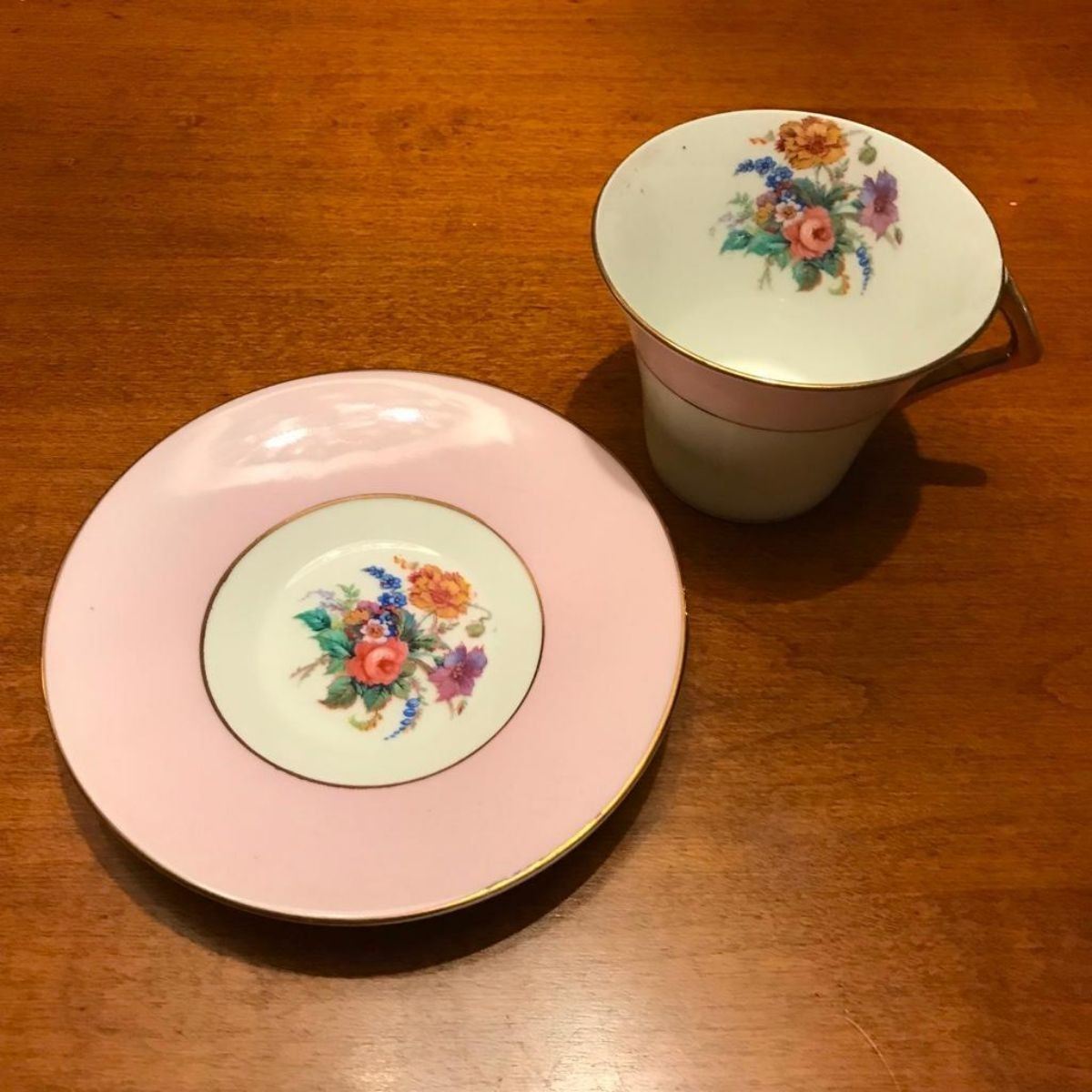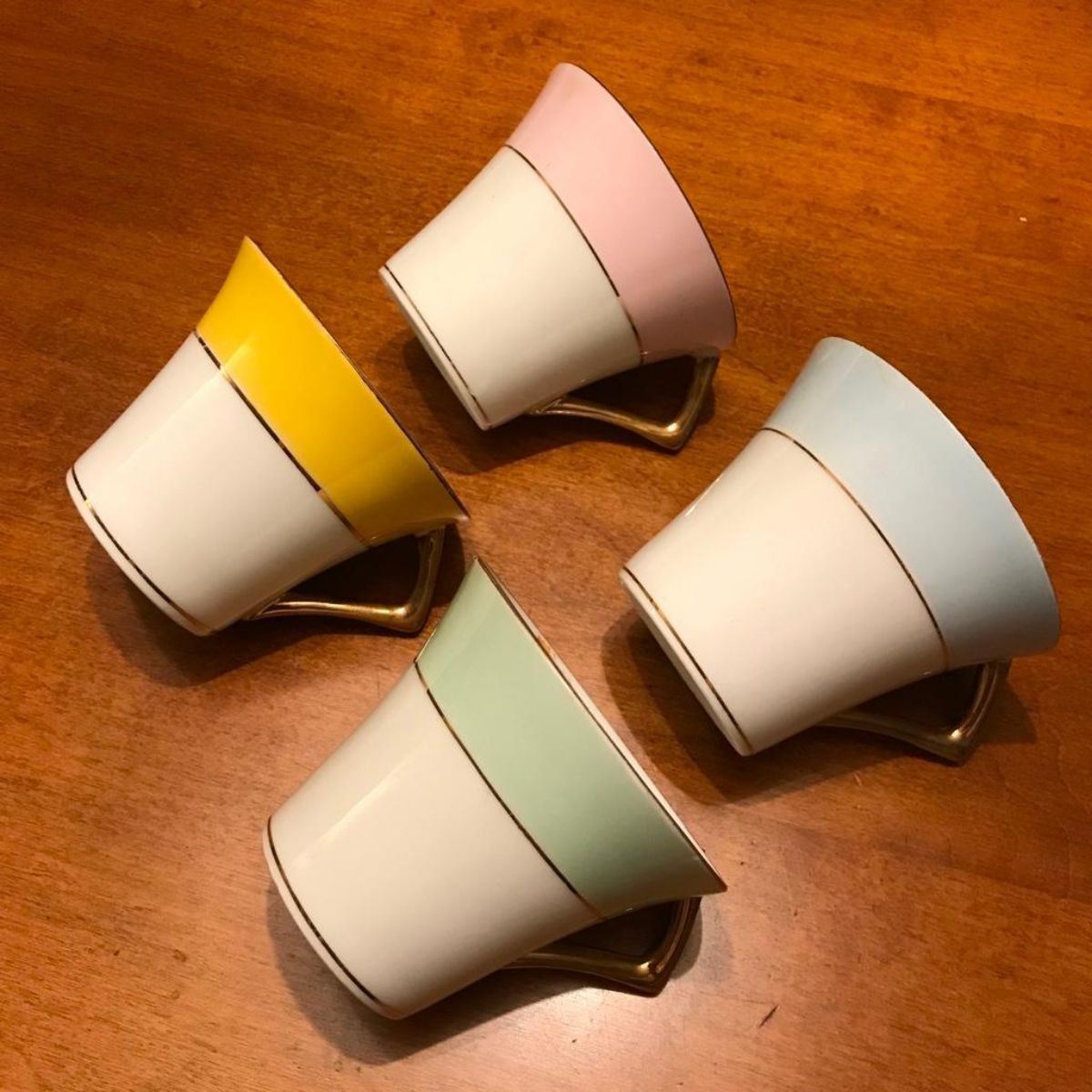 Set of four Colclough English bone china demitasse cups with matching saucers set. Four pastels, in pink, blue, yellow & green with matching floral motif & gilt edging for each. On the bottom of each cup & saucer printed Colclough China, Made in Longton England, Genuine Bone China. Also gilt number on each piece. A lovely set.Â