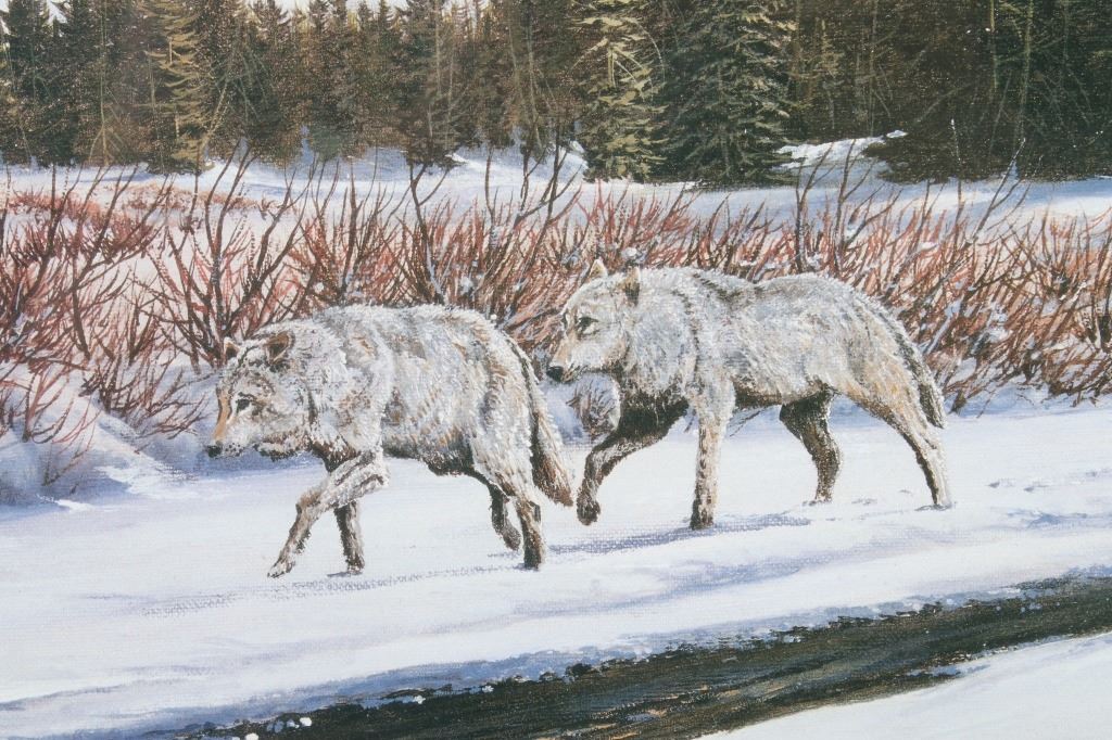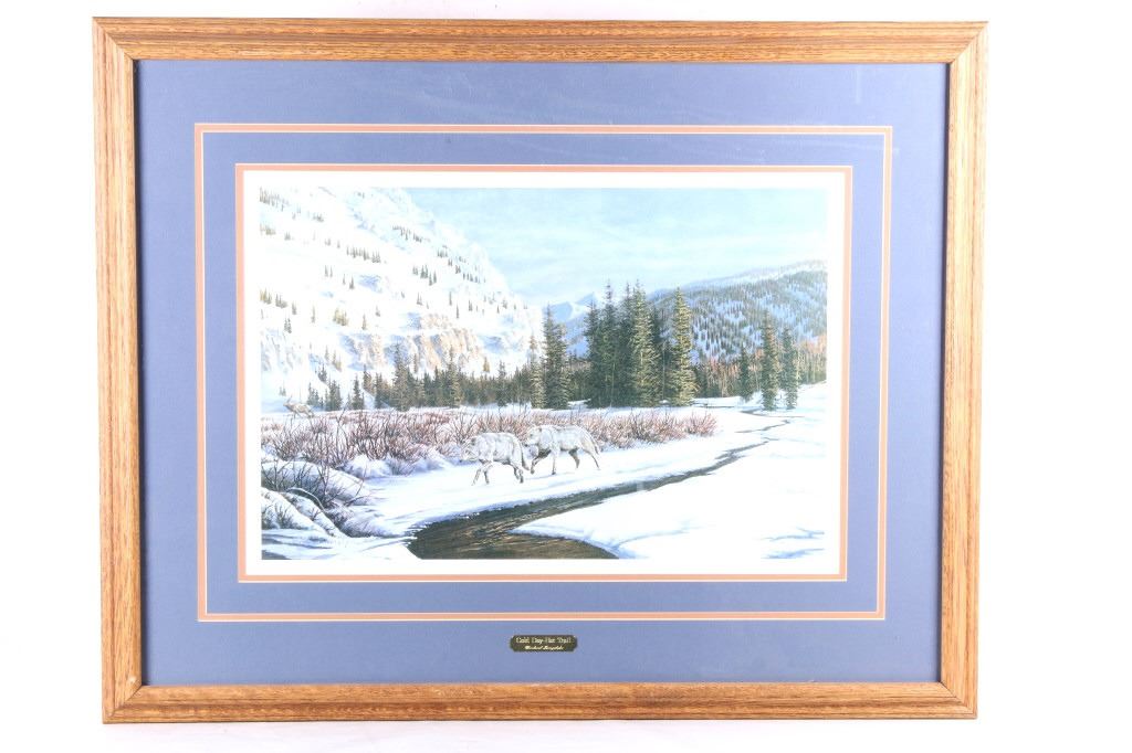 For your consideration is this painting called Cold Days Hot Trail by Michael Bargelski. Michael Bargelski... was an ardent sportsman. He painted from first-hand knowledge of his subject and his paintings of waterfowl have been an inspiration to other conservationists. Michael has won numerous awards over the years. He was also a long time sponsor of Ducks Unlimited and has won three "1st in State" awards for originals paintings in Utah, Nevada and Idaho. He also won Best in Show at the National Wildlife show in Kansas City in 1986. Michael was born in Pennsylvania in 1944. He moved west in 1966 and settled in Idaho. He passed away in March 30, 2015. This painting shows two wolves on the prowl on a cold winter day in the hill country by a fridged creek. The measurements of this painting are 31" x 39".