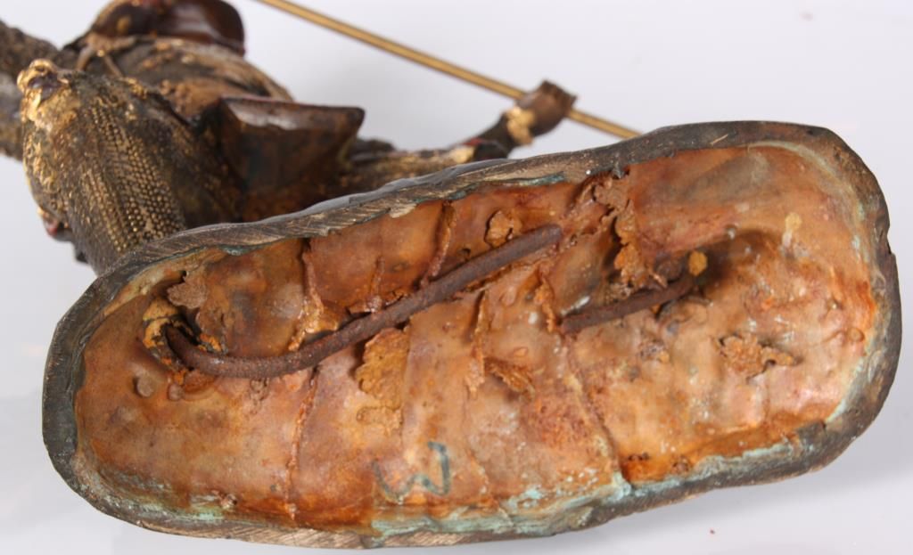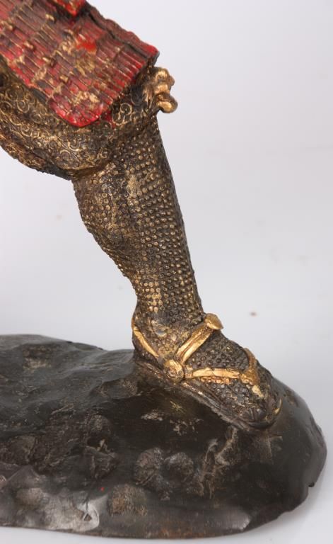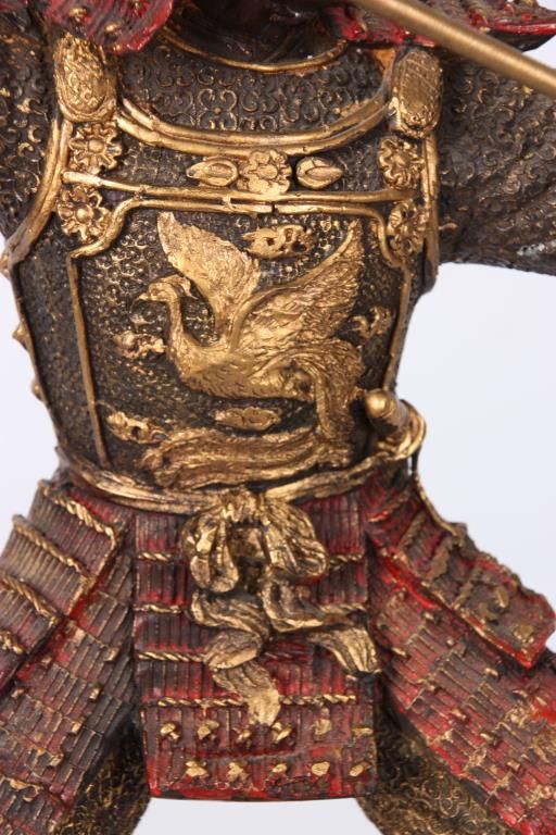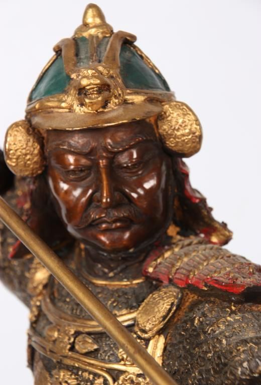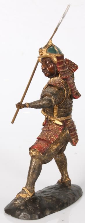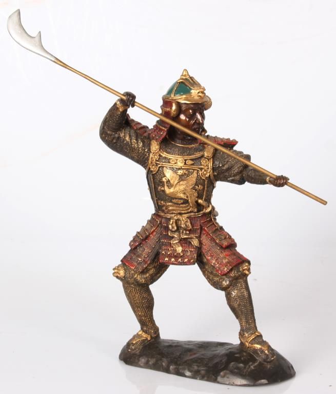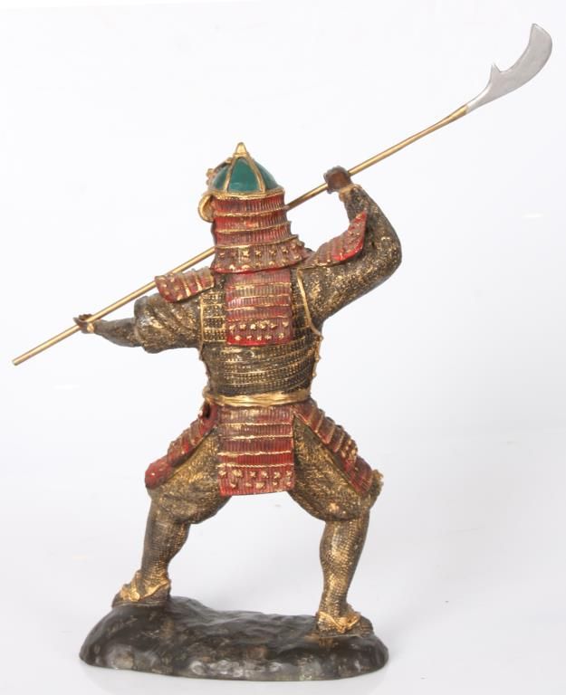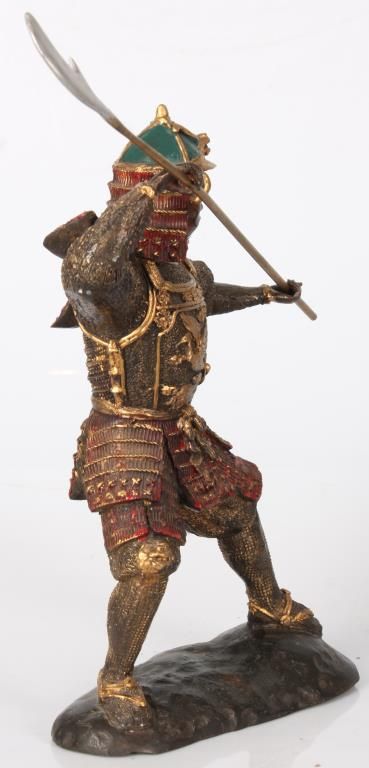 Cold Painted Bronze Samurai Warrior. Figural cold painted bronze of a samurai warrior wearing full armor and armed with a naginata (staff & blade weapon); beautifully cast and brilliantly painted. circa 20th Century. 16 in. high.