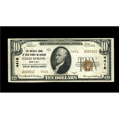 <B>Cold Spring, NY</B></I> - $10 1929 Ty. 2 <B>The NB of Cold Spring</B></I> Ch. # 4416<BR>An attractive example from this charming Hudson Valley community, our home town in the mid-1970's. This bank is just plain rare in both large and small size, as it had a miniscule issue befitting its limited capital of $12,500. This piece was obtained by our consignor from our May, 1999 sale, where it realized almost $1500. Expect it to bring more tonight, likely considerably more. Nice <B>Fine-Very Fine.</B></I>
