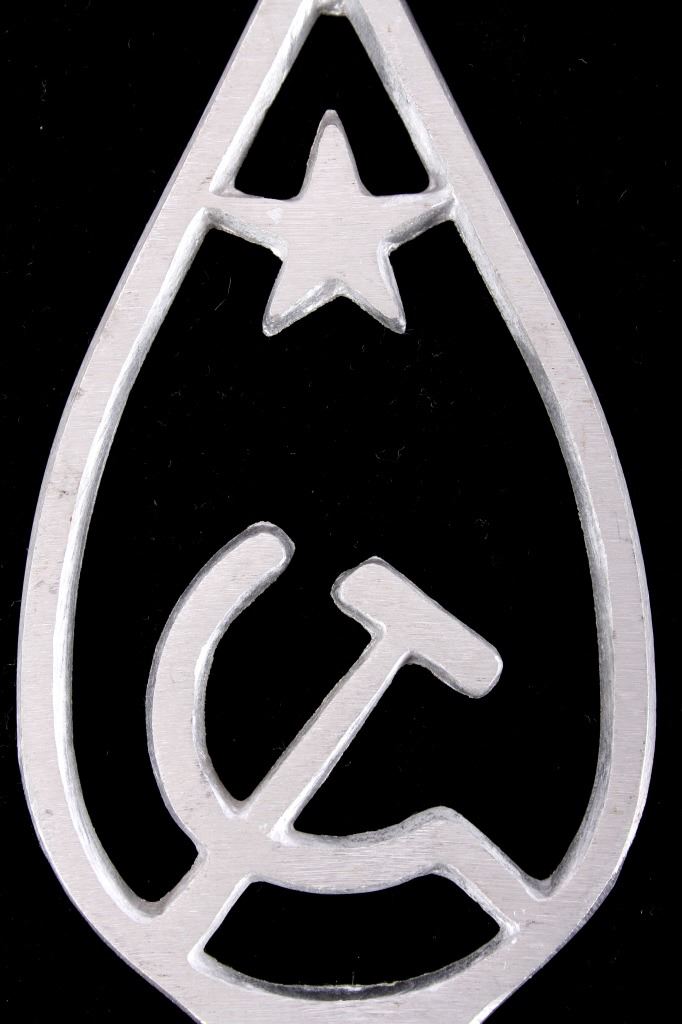 You are bidding on a flagpole topper of Soviet Russia believed to be from the Cold War era. The topper is of aluminum alloy in the shape of a flame. Inside the base of the flame is the Soviet hammer and sickle with the star inside the top. On the back side at the base of the flame is the maker's mark. The topper measures 9.75" x 3.5" and is in good condition.