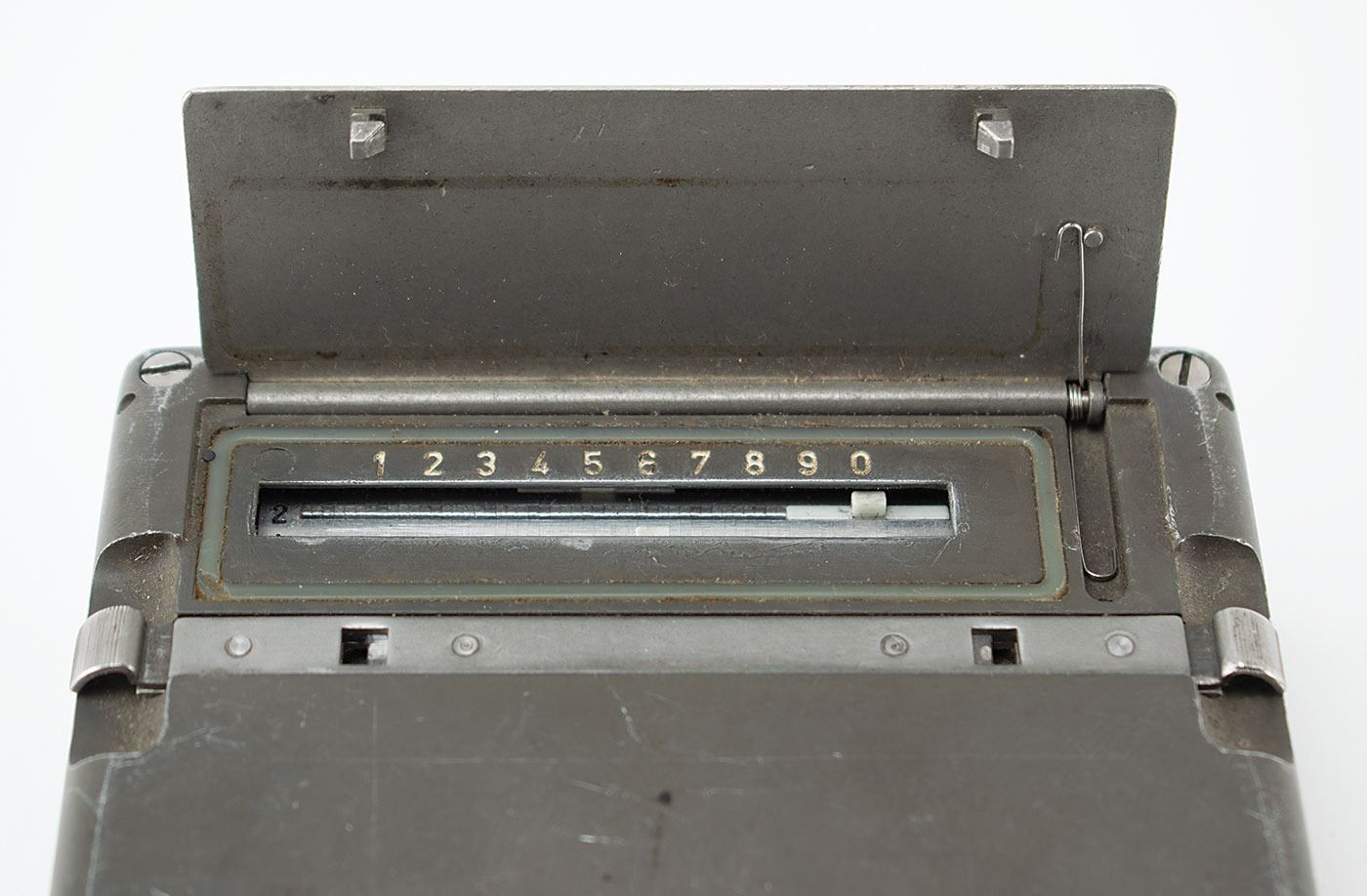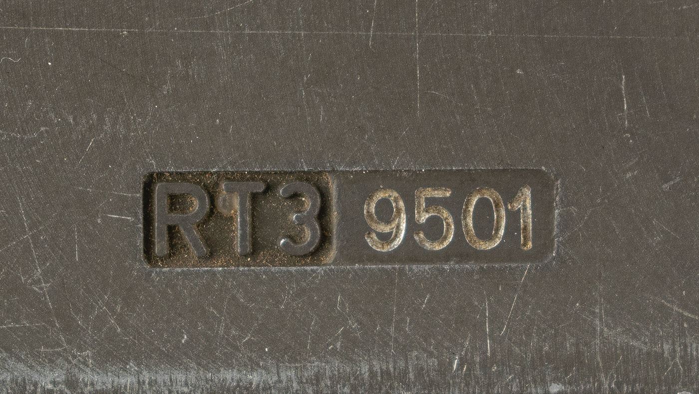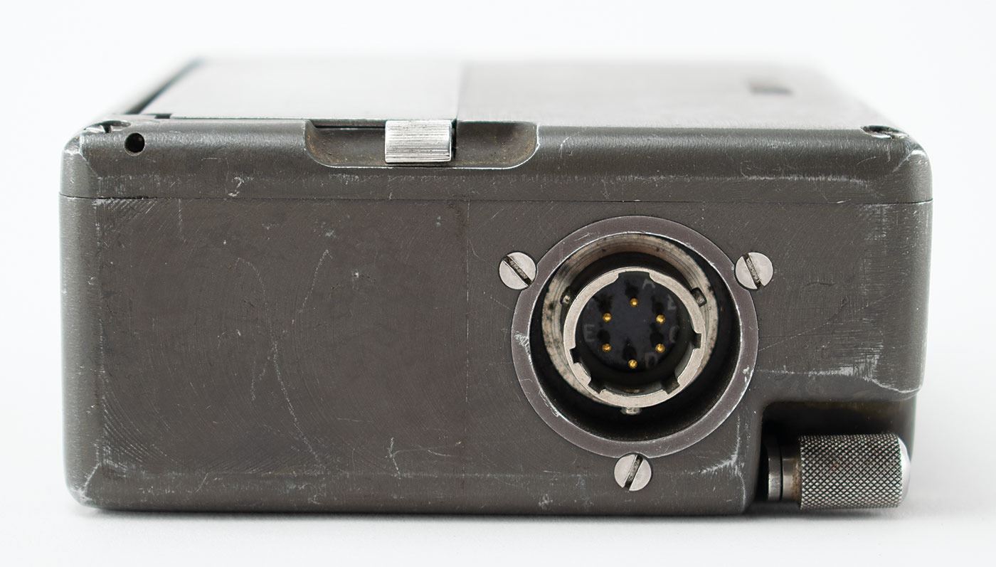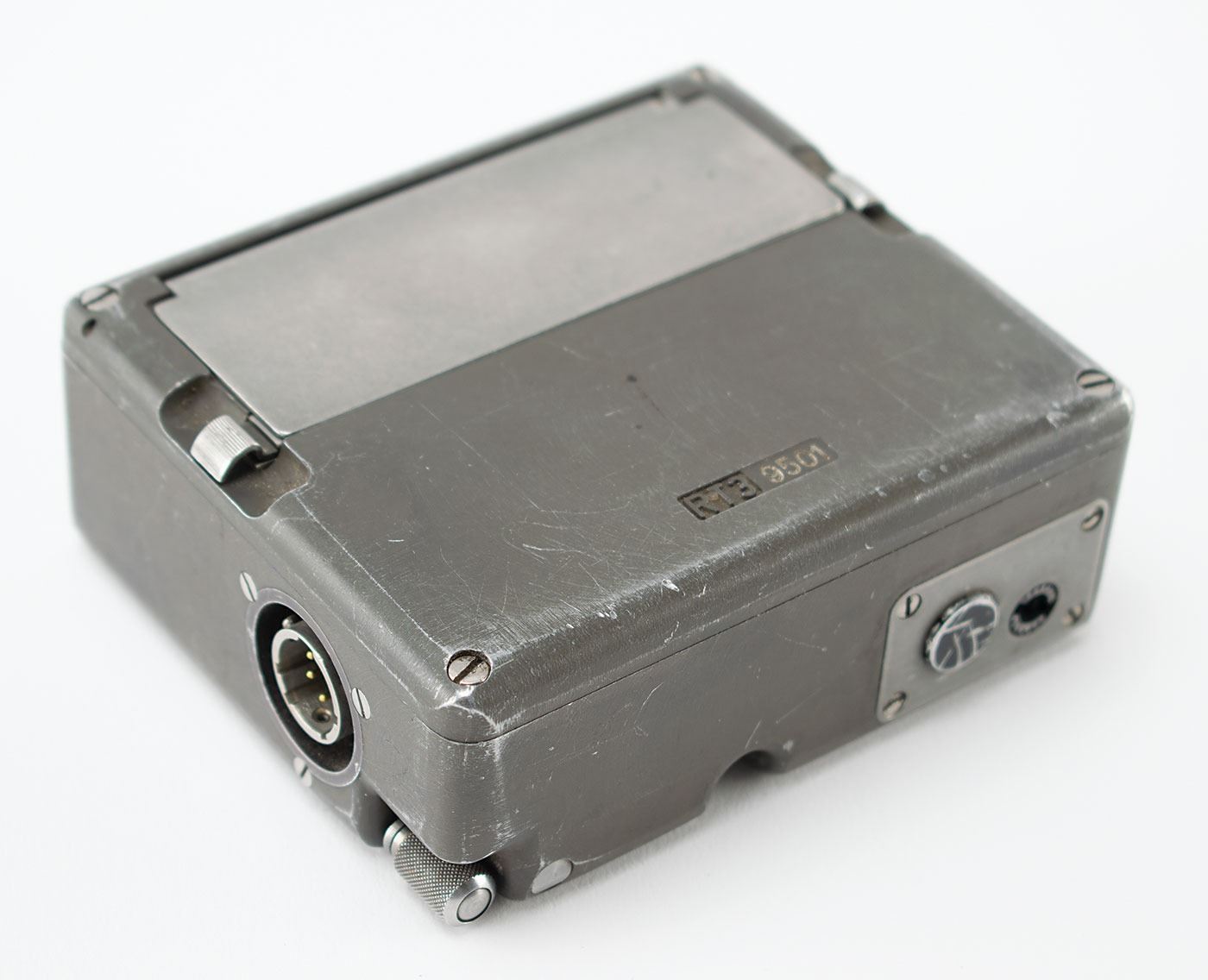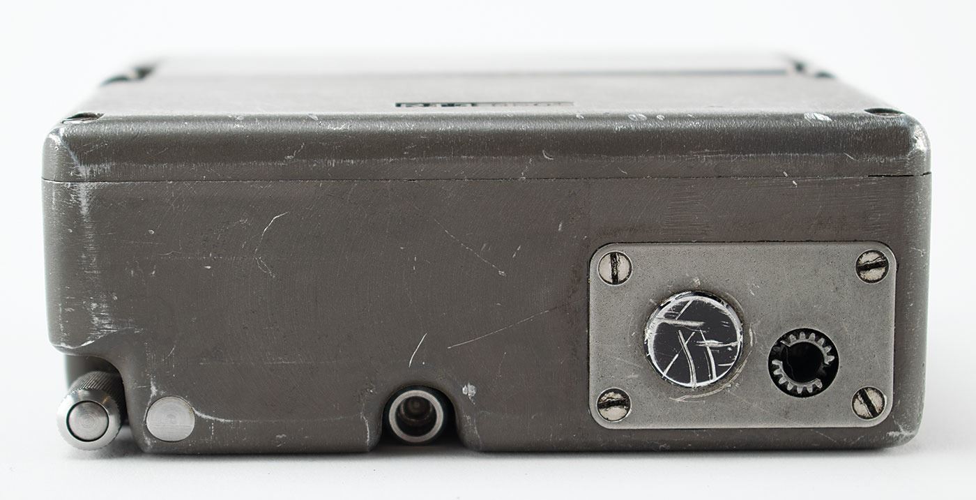 Circa 1958 Cold War–era clandestine RT-3 electromechanical burst encoder, developed by Wandel & Goltermann for the German Federal Intelligence Service (BND). The device measures 4.25˝ x 3.5˝ x 1.5˝, and is marked on the case with serial number "RT3 9501." The heavy-duty case has a spring-loaded panel that opens to reveal the mechanical memory cylinder, which rotates to reveal 25 horizontal bars, each with a tab moveable to ten positions. The cylinder crank is stored in a cleverly milled-out cavity in the bottom of the unit. A user could load 25 characters into this mechanical memory, and the unit would transmit them at high speed in Morse code, which made interception and direction-finding very difficult. In very good to fine condition. Accompanied by a modern operating manual detailing the history and function of the RT-3.