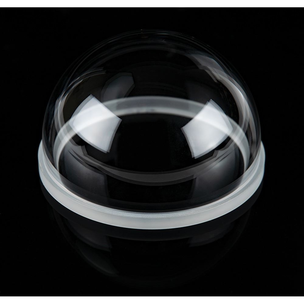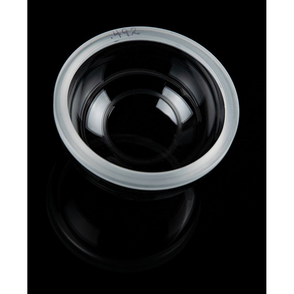 Cold War-dated gun or bombsight optical window, comprised of a spherical glass dome made of fused silica that measures 4" x 2.5", with inner rim marked "492." Includes the original shipping box stamped "Reusable Container and Dunnage, Do Not Destroy," with affixed parts label: "6605-00-606-1159, 28215500010, DOME, 1 ea., A2-82." In fine condition. This particular dome-like optical window resembles examples similar to a Boeing B-54 bomber gunsight (1947-1949) and a Farrand Y-7 bombsight (circa 1952).