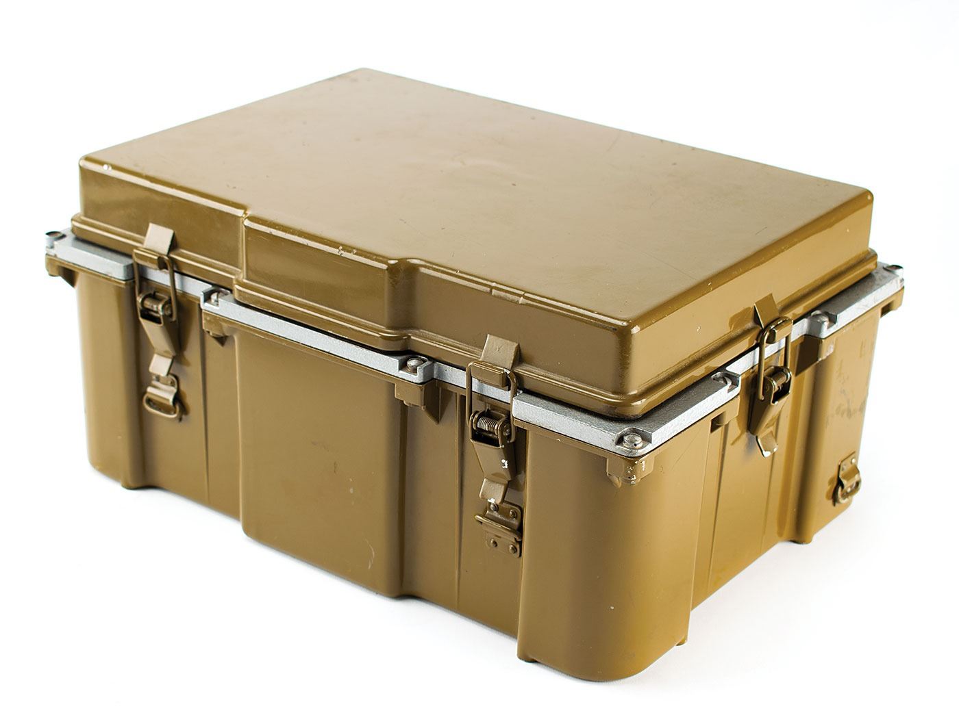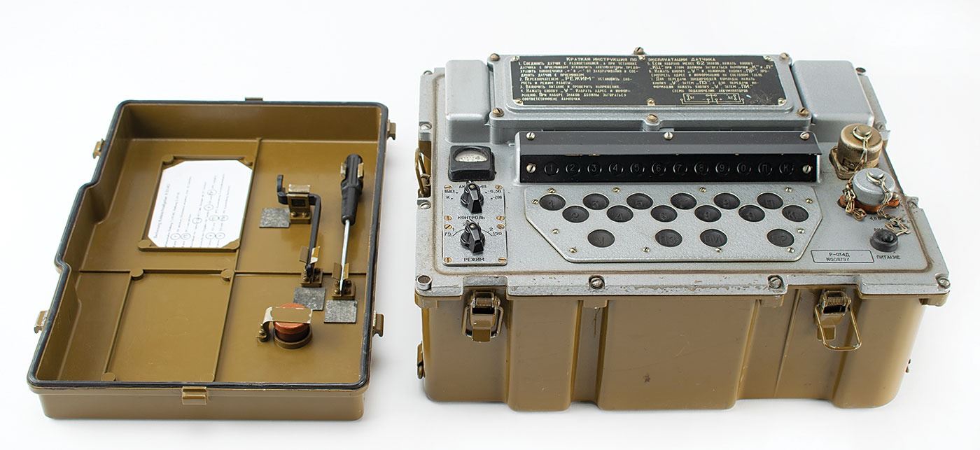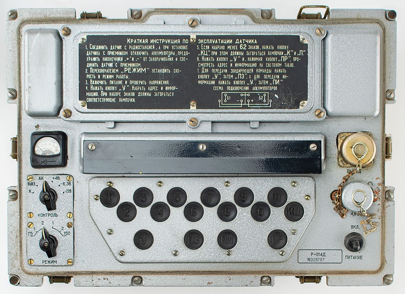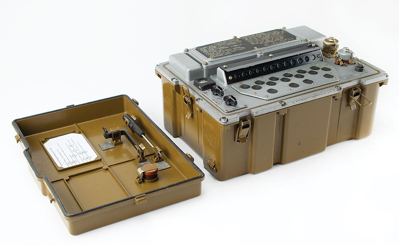 Cold War–era Soviet R-014D electronic burst encoder, codenamed 'Datchik,' as used in conflict areas to transmit battlefield commands. The unit measures 14˝ x 10˝ x 7˝, and features a 16-key keyboard, lamp panel display, voltage meter, voltage check switch, mode selector, and on/off switch. The unit allowed the operator to transmit a message in Morse code at a very high speed, helping to evade interception and radio direction finding. Given the importance of the data sent, the device incorporated advanced error-detection and error-correction. In very good to fine condition.