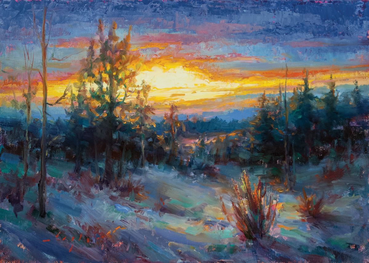 Artist: Katherine Taylor. Title: ColdFire. Medium: Oil on canvas. Size: 10" x 14". Framed size (if applicable): 16" x 20" Artist's description: Cross country skiing in the back lands of the Cascade Mountains near Sisters, Oregon. It was very late and I knew I had to hustle to get back to the car before I lost the light completely. However, as I turned to go back, an absolute flare of light occurred as the sun glowed behind the cold clouds. What a rare burst of color! Shipping from ZIP CODE 97702.