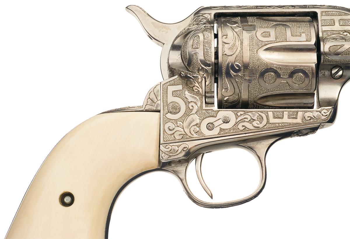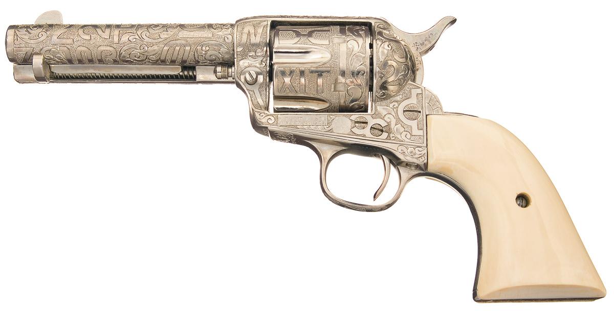 Manufactured in 1905. The revolver was subsequently engraved in the style of Cole Agee with cattle brand engraving. All of the surfaces of the revolver with the exception of the hammer, front strap and cylinder flutes are engraved with Western cattle brands on a stippled background with some floral scroll designs mixed in. The left side of the barrel has the 2 lazy 2 P brand among others. The top of the barrel is marked "COLT'S PT. F.A. MFG. Co. / HARTFORD CT. U.S.A.", the left side of the barrel is marked with the caliber designation "45 COLT." in a panel with oval borders and the left side of the frame is stamped with the Colt, two line, three patent dates in a panel followed by the circled Rampant Colt. The matching serial number is marked on the bottom of the frame, trigger guard and backstrap. The loading gate is marked with the assembly number "418". Standard blade front and frame notch rear sights and fitted with smooth two piece ivory grips.