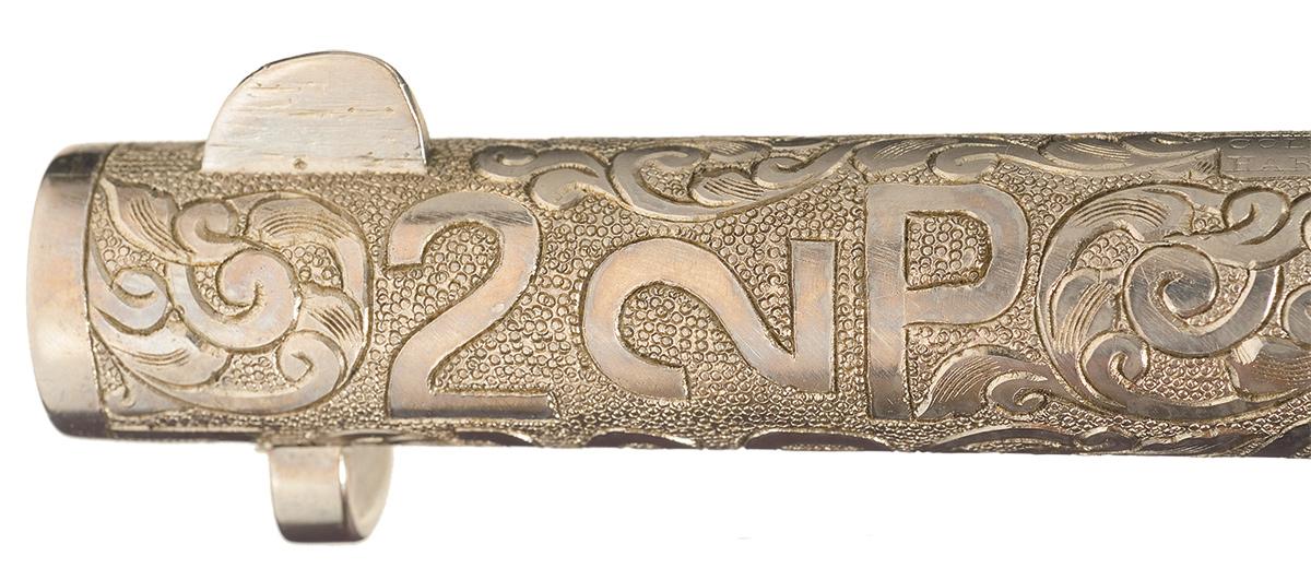 Condition: Custom embellished and refinished with 99% nickel finish remaining. The inside area of the trigger guard is a bit roughly finished and shows some pin prick type pitting under the finish. The grips are excellent, aging to a pleasant mellow patina with an attractive grain pattern. The serial number on the frame and trigger guard have been re-stamped, otherwise the engraving and markings are clear. The action is excellent.