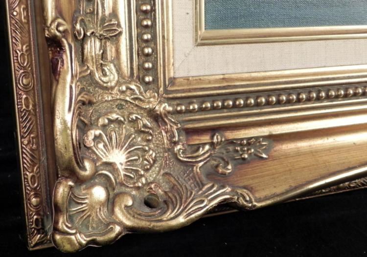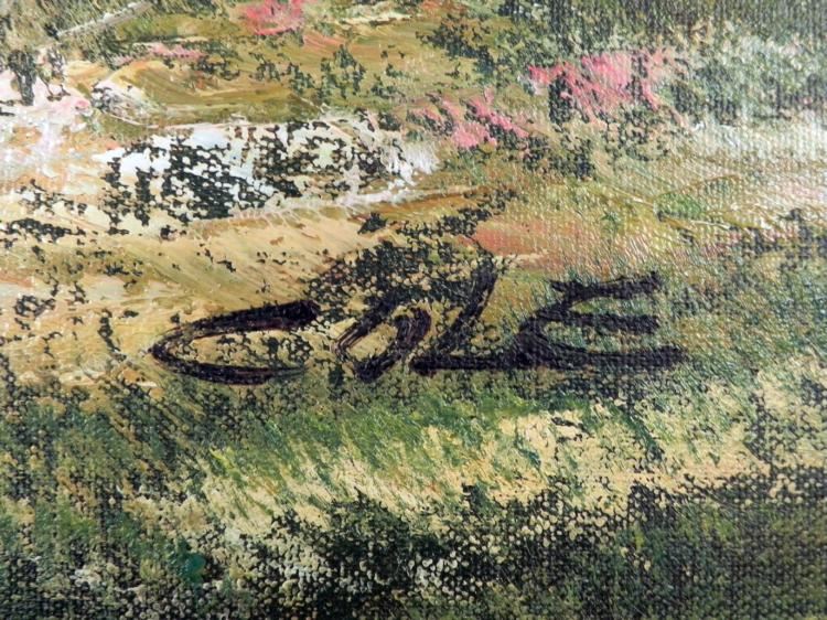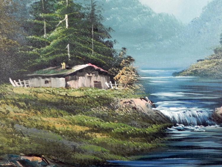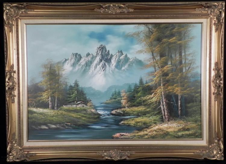 This painting portrays a majestic mountain landscape, and a small cabin nestled at the bluff of a river. The bright mountain peaks stand out in the sun, as do the golden leaves of the tall trees. Artist: Cole Signature: "COLE" in paint, lower right Medium: Oil on canvas Image size: 23 1/2 x 35 1/2 inches Framing: In ornate gold painted wooden frame, with linen and gold chrome inner border Frame size: 32 x 44 inches Condition: Excellent