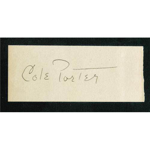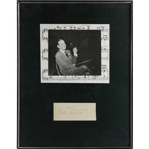 <B>Cole Porter Signature</B></I> on a page 4" x 1.5". Handsomely matted and framed with a music score background and a photograph of Porter to an overall size of 11" x 14".