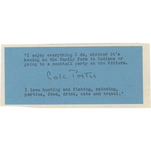 <B>Cole Porter Signature</B></I> on card, 5.5 x 2.25, mounted on stiff card stock with a typed note from Porter. Cole Albert Porter (1891-1964) was an American composer and songwriter from Indiana. His works include the musical comedies <I>Kiss Me, Kate, Fifty Million Frenchmen</B></I> and <I>Anything Goes,</B></I> as well as songs like "Night and Day", "I Get a Kick Out of You" and "I've Got You Under My Skin". He was noted for his sophisticated (sometimes ribald) lyrics, clever rhymes, and complex forms. Irving Berlin used to refer to Porter's "Begin the Beguine" as "that long, long song." Very fine. <BR><BR><b>Shipping:</b> Flat Material, Small (<a target="_blank" href="http://www.heritageauctions.com/common/shipping.php">view shipping information</a>\)