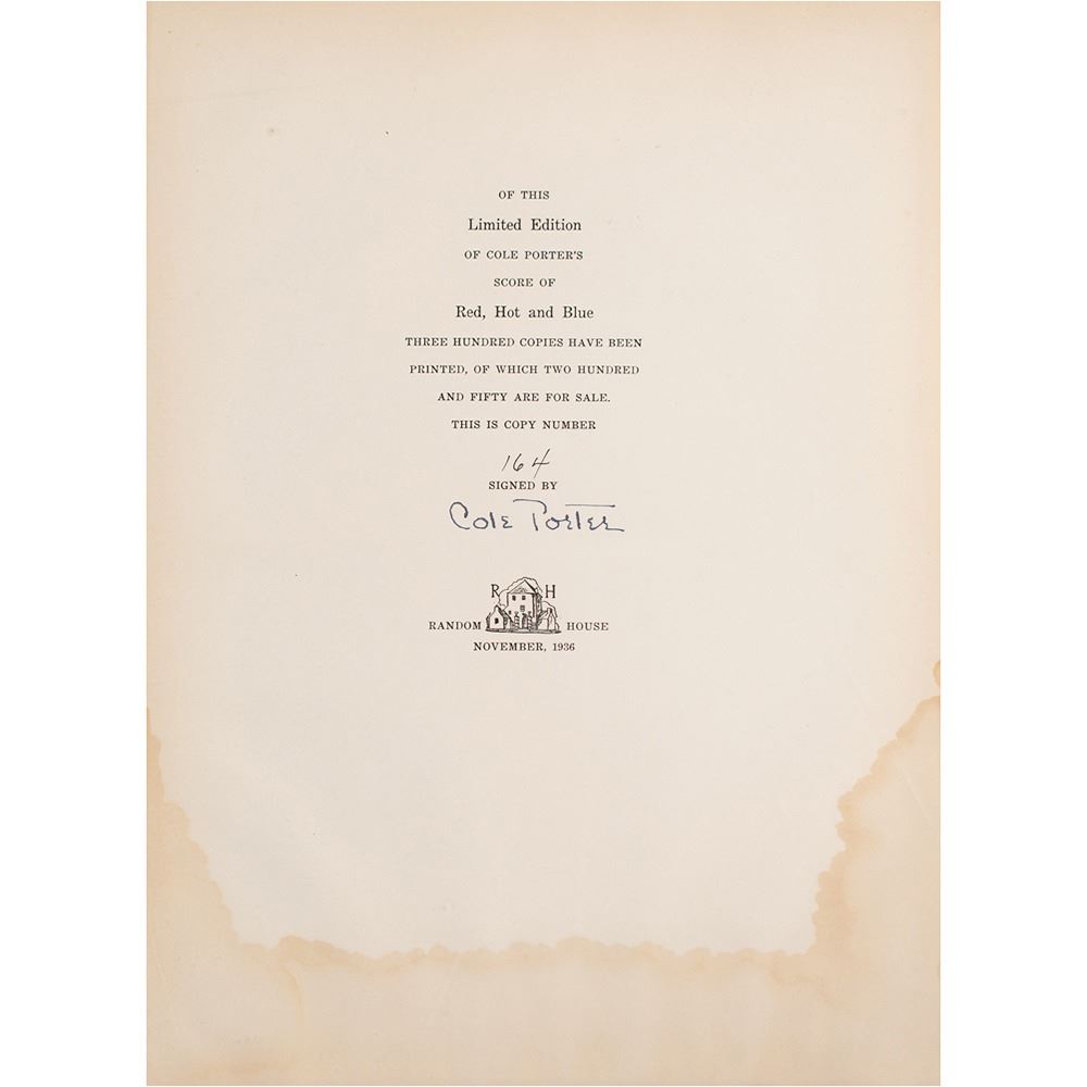 Signed book: Red Hot and Blue. First edition, limited issue, numbered 164/300. NY: Random House, 1936. Hardcover, 9.25 x 12.25, 53 pages. Signed on the colophon in fountain pen, "Cole Porter." In good to very good condition, with toning and severe dampstaining to lower portion of book, scuffing and wear to the covers, and damage and loss to the spine.