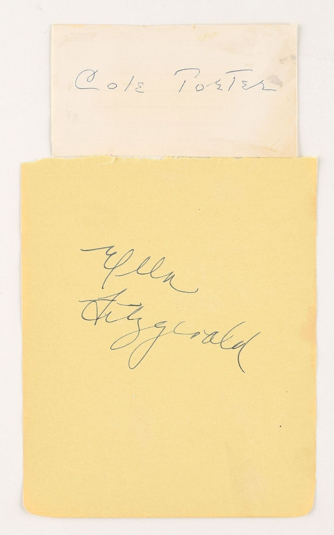Two items: a ballpoint signature, "Cole Porter," on an off-white 3.75 x 2 card; and a fountain pen signature, "Ella Fitzgerald," on a yellow 5.5 x 4.5 album page. In overall fine condition, with some light stains to the Porter signature. In 1956, American jazz singer Ella Fitzgerald released the studio album Ella Fitzgerald Sings the Cole Porter Song Book. Featuring a studio orchestra conducted and arranged by Buddy Bregman, the album was inducted into the Grammy Hall of Fame in 2000. Upon listening to the album, Porter remarked: 'My, what marvelous diction that girl has.' Accompanied by a certificate of authenticity from PSA/DNA and a letter of authenticity from JSA.