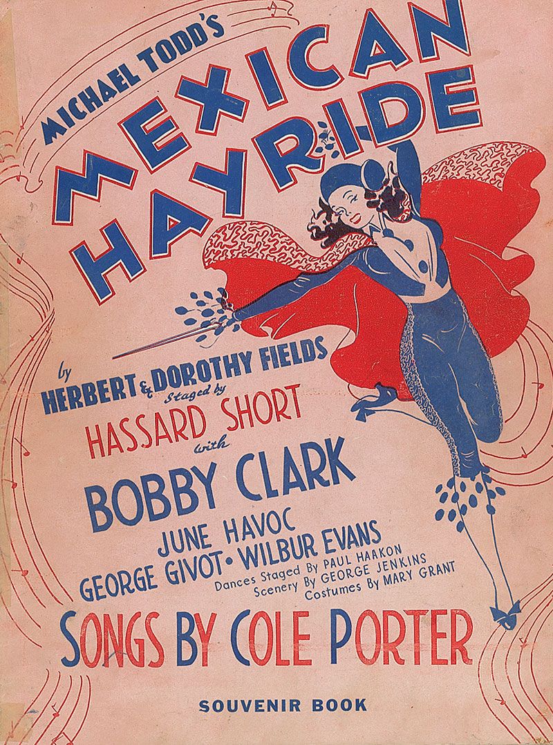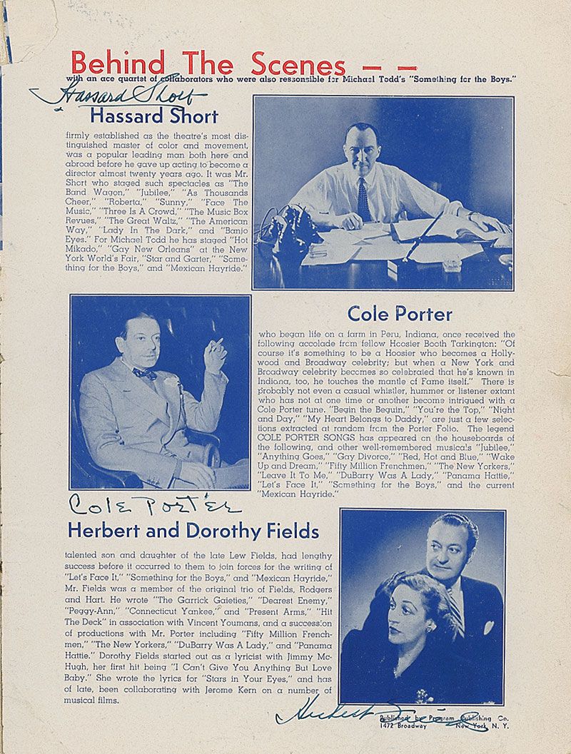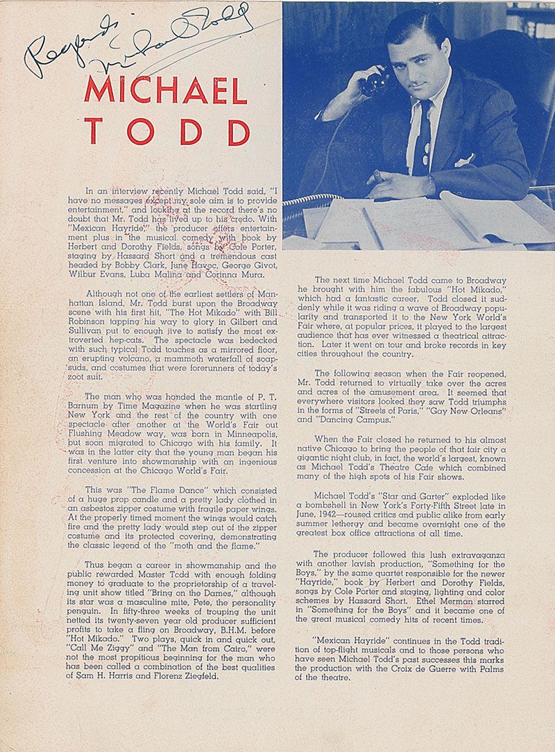 Program from Mexican Hayride, 9 x 12, signed on the inside of the front cover by Michael Todd, and underneath his image on the final page by Cole Porter. Program is also signed throughout by other cast members and executives, including June Havoc (twice on the back cover), Hassard Short, Herbert Fields, George Givot, Luba Malina, Corinna Mura, Sergio DeKarlo, Hank Wolf, and Edith Meiser, with a couple other signatures inside traced over, including another Havoc signature. In very good condition, with old tape repairs to partially separated spine, scattered light soiling, a few traced over signatures, and expected handling wear.