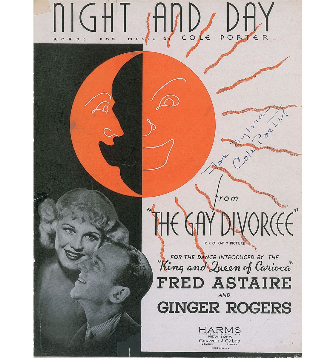 Vintage sheet music for ‘Night and Day’ from The Gay Divorcee, 9 x 12, seven pages, signed and inscribed on the front cover in fountain pen, “For Sylvia, Cole Porter.” In very good to fine condition, with a few light creases, small tape-repaired tears to left corners and bottom edge, and some light chipping to edges