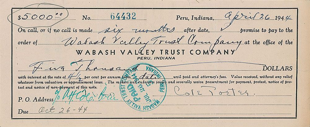 Partly-printed DS, one page, 8.5 x 3.5, April 26, 1944. Promissory note for $5000, plus 4.5% interest, between Porter and the Wabash Valley Trust Company, for a six-month period. Signed at the bottom by Porter. Three vertical folds, one through a single letter of signature, a stamp to bottom portion, some light edge toning, and a pencil circle to top left, otherwise fine condition.