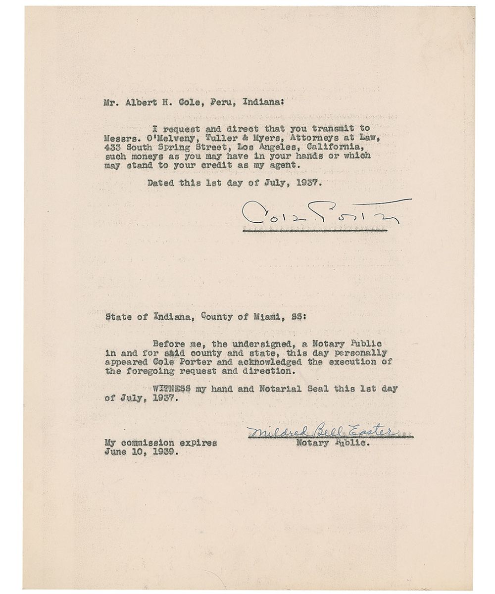 Notarized DS, one page, 8.5 x 11, July 1, 1937. Instructions to Albert H. Cole of Peru, Indiana, to “transmit to Messrs. O’Melveny, Tuller & Myers…Los Angeles, California, such moneys as you may have in your hands or which may stand to your credit as my agent.” Signed by Porter and also signed by a notary public. In fine condition.