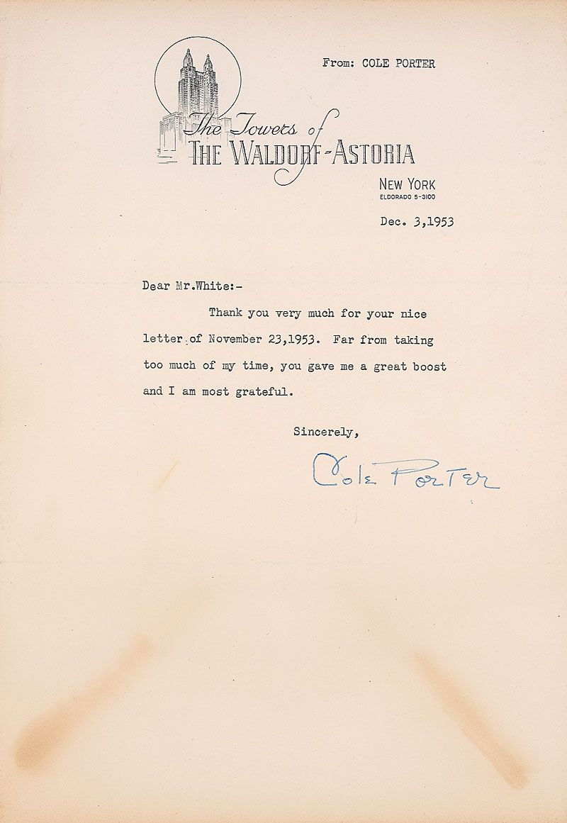 TLS, one page, 7 x 10.25, Towers of the Waldorf-Astoria letterhead, December 3, 1953. Letter reads, in full: “Thank you very much for your nice letter of November 23, 1953. Far from taking too much of my time, you gave me a great boost and I am most grateful.” Toning to edges, as well as two diagonal strips of toning along bottom blank portion, otherwise fine condition. Accompanied by the original mailing envelope.
