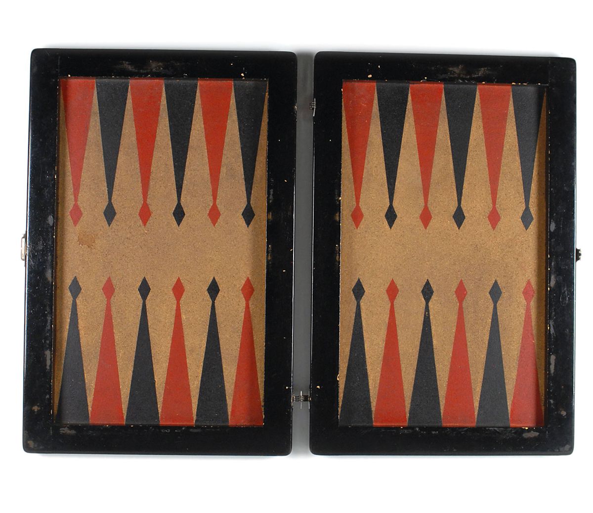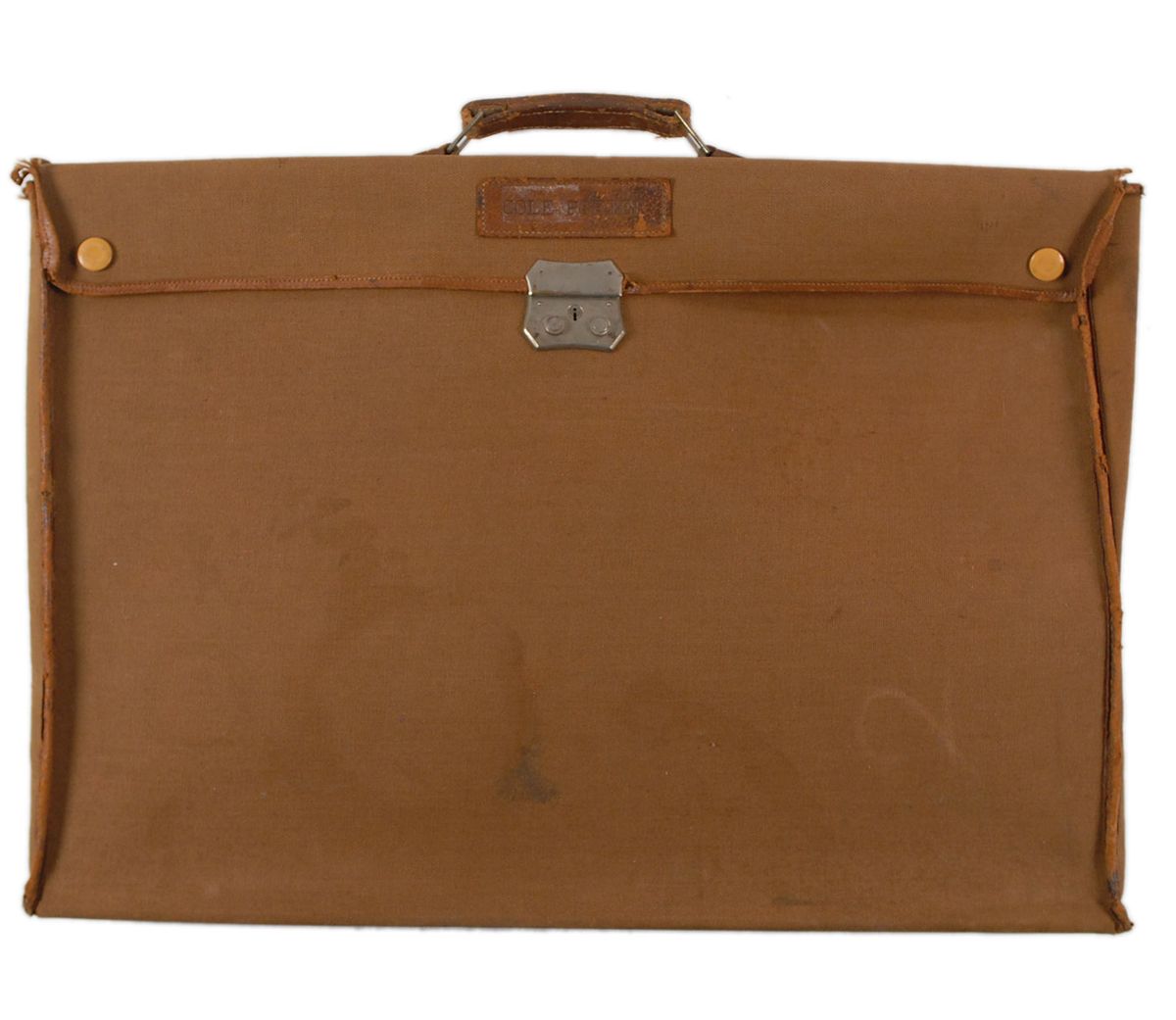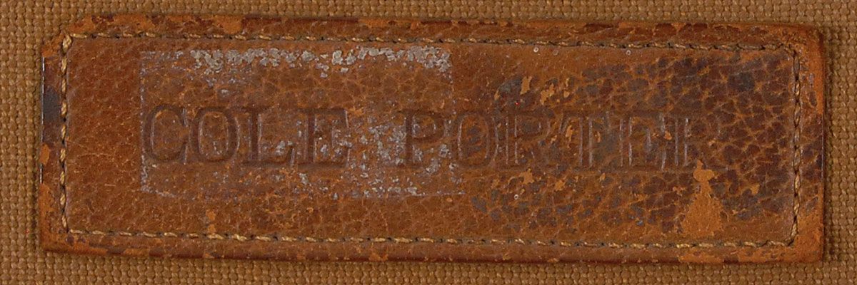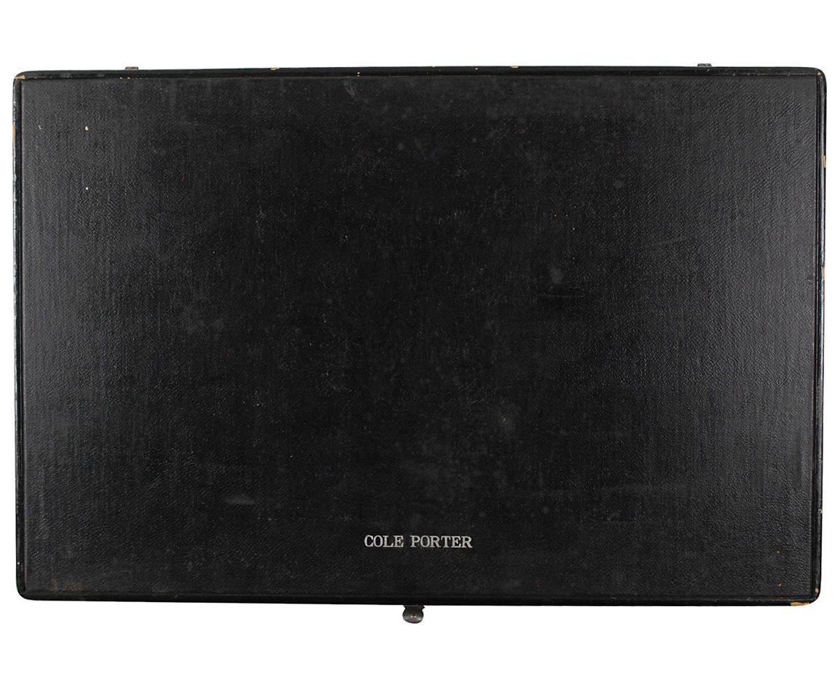 Porter’s personally-owned and -used portable backgammon board which folds to 22 x 14 x 2, hinged on one side with a clasp on the other, with “Cole Porter” imprinted in silver on the top. The game board features red and black points. Includes the brown canvas carrying case, with a leather patch impressed with “Cole Porter” sewn to the front flap. In very good condition, with one of the hinges detached from the board and general wear to board and carrying case, suggesting frequent use. Porter loved to gamble and play backgammon so much that it even inspired the line of lyrics, ‘For the fortune I lost when you taught me backgammon,’ in his 1934 song ‘Thank You So Much Missus Lowsborough-Goodby.’ A previous owner, Porter’s cousin Louise Cole Schmitt, once related a story about how she and the composer bet pieces of candy during their games of backgammon.