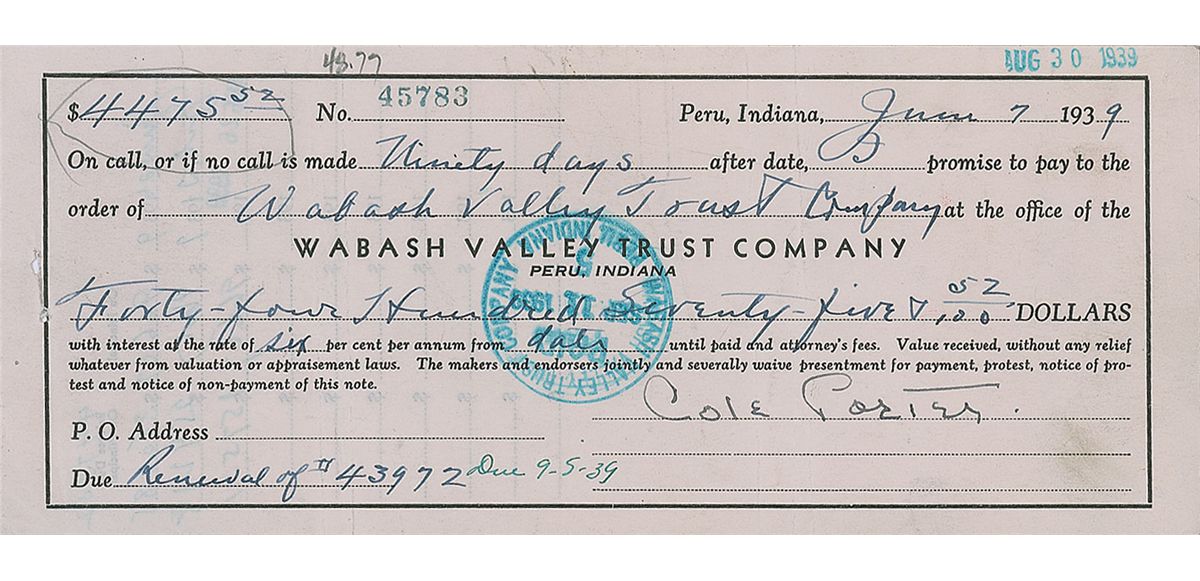 Partly-printed DS, one page, 8.5 x 3.5, June 7, 1939. Promissory note for $4475.52 payable to the Wabash Valley Trust Company in 90 days, Signed at the conclusion by Porter. Several vertical folds, and expected stamps and notations, otherwise fine condition.