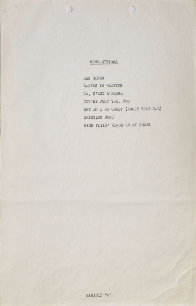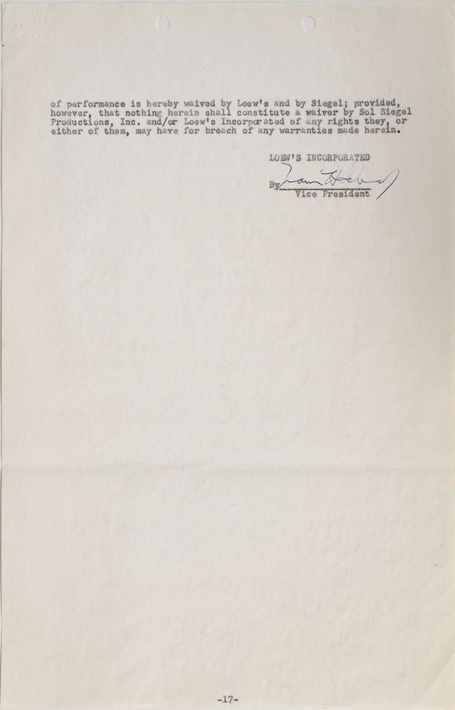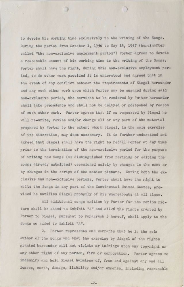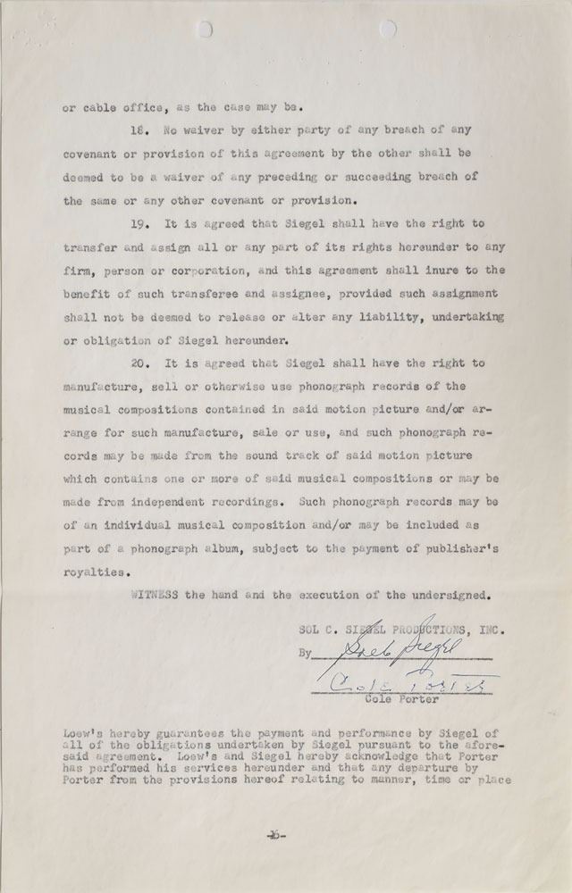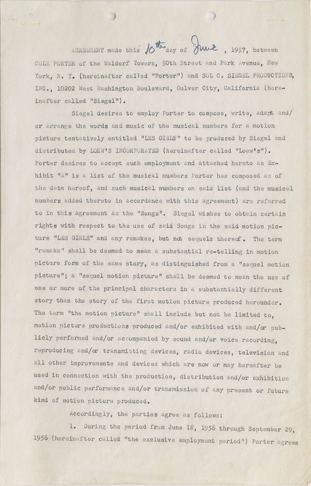 DS, eighteen pages, 8.5 x 13, June 10, 1957. Contract between Porter and Sol C. Siegel Productions, in part: "Siegel desires to employ Porter to compose, write, adapt and/or arrange the words and music of the musical numbers for a motion picture tentatively entitled 'Les Girls' to be produced by Siegel and distributed by Loew's Incorporated." The agreement outlines Porter's work schedule, grants associated rights to the resulting material, and describes the financial arrangements of the contract. Signed at the conclusion in fountain pen by Siegel, Porter, and a Loew's vice president. A page headed "Exhibit 'A'" lists Porter's compositions: "Les Girls," "Ladies in Waiting," "Ca, C'est L'amour," "You're Just Too, Too," "Why Am I So Gone? (About That Girl)," "Drinking Song," and "High Flyin' Wings On My Shoes." In fine condition.